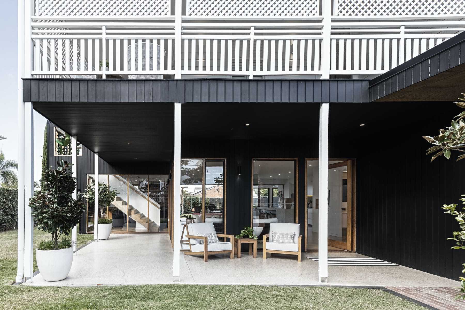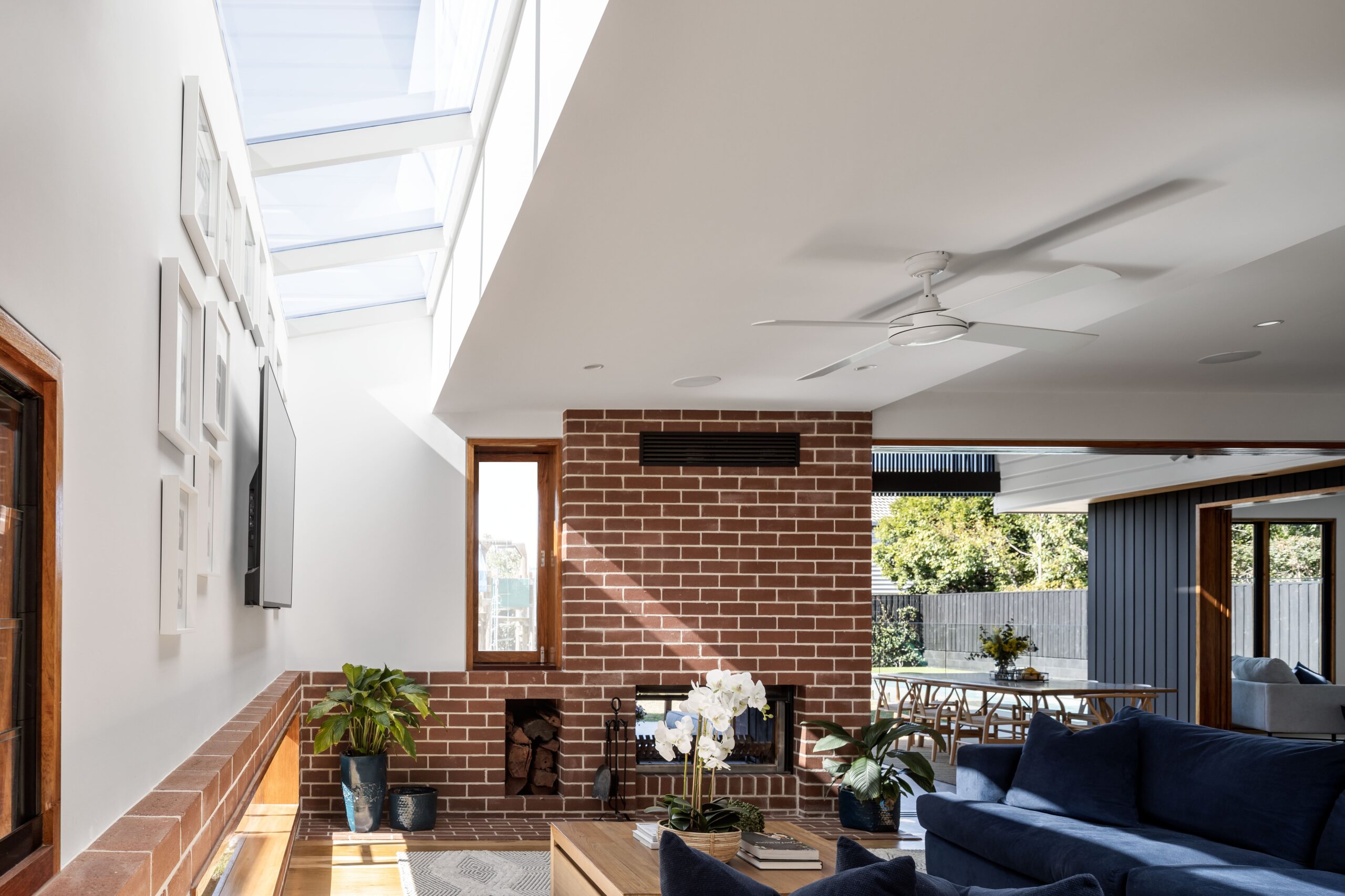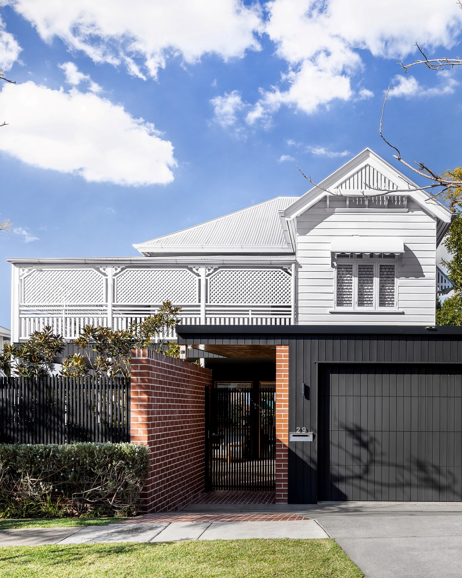 The addition of a large, light-filled ground floor was made possible by raising the original one-storey house. Mindful of the home’s generous size — and so as not to appear too imposing within the context of the neighbourhood — proportions of the new carport, entry gateway and fencing were all designed to complement rather than compete with the streetscape.