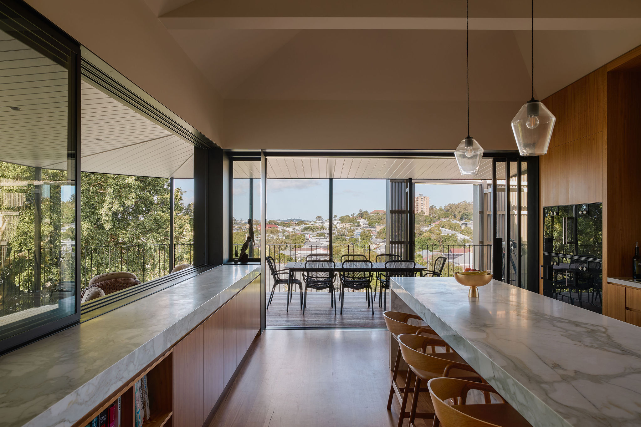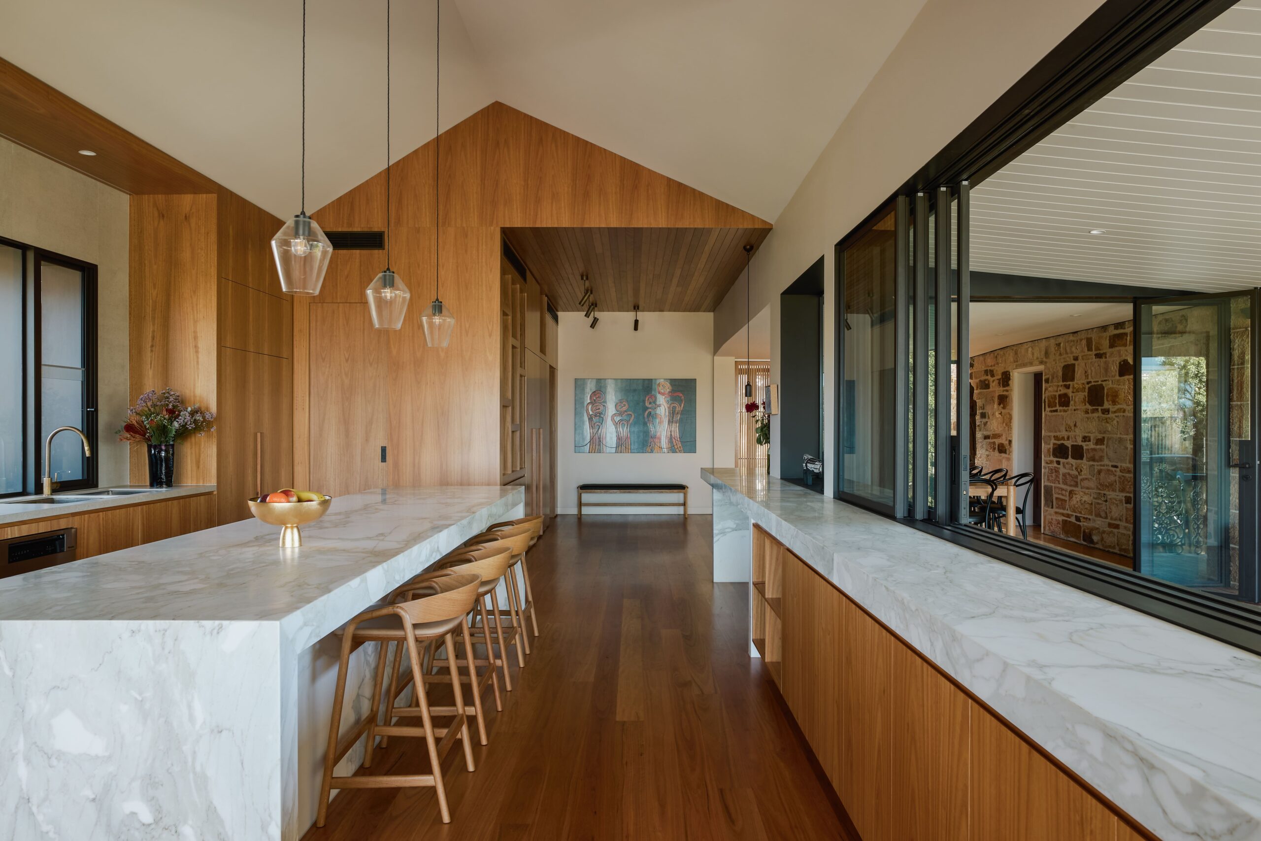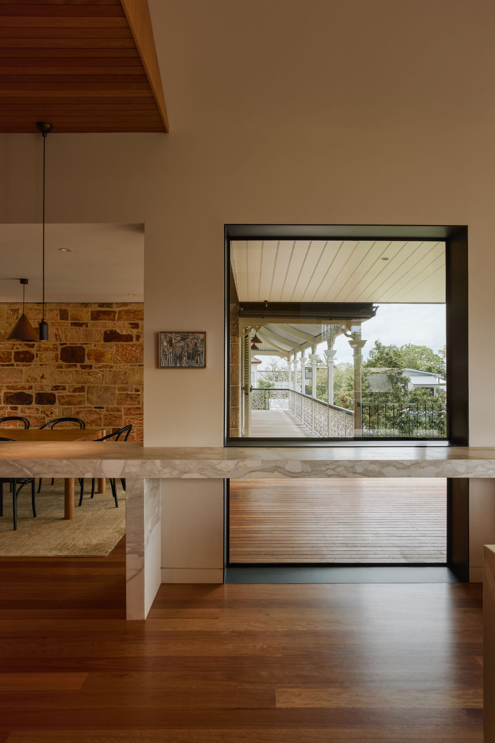 The kitchen was relocated to become the heart of the home. In its new location, it can better connect with its surroundings – the rolling hills, majestic fig tree, and the heritage house itself.