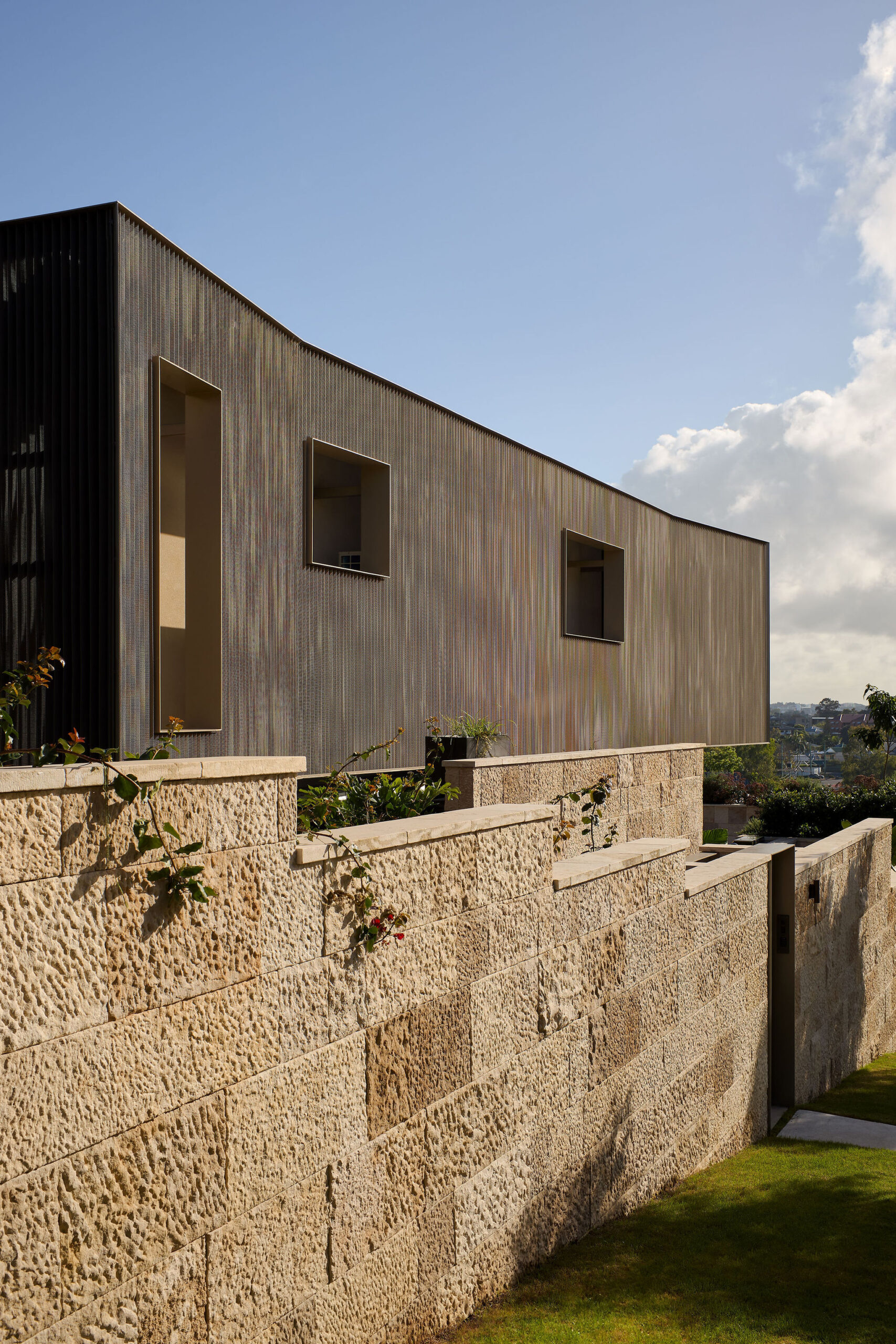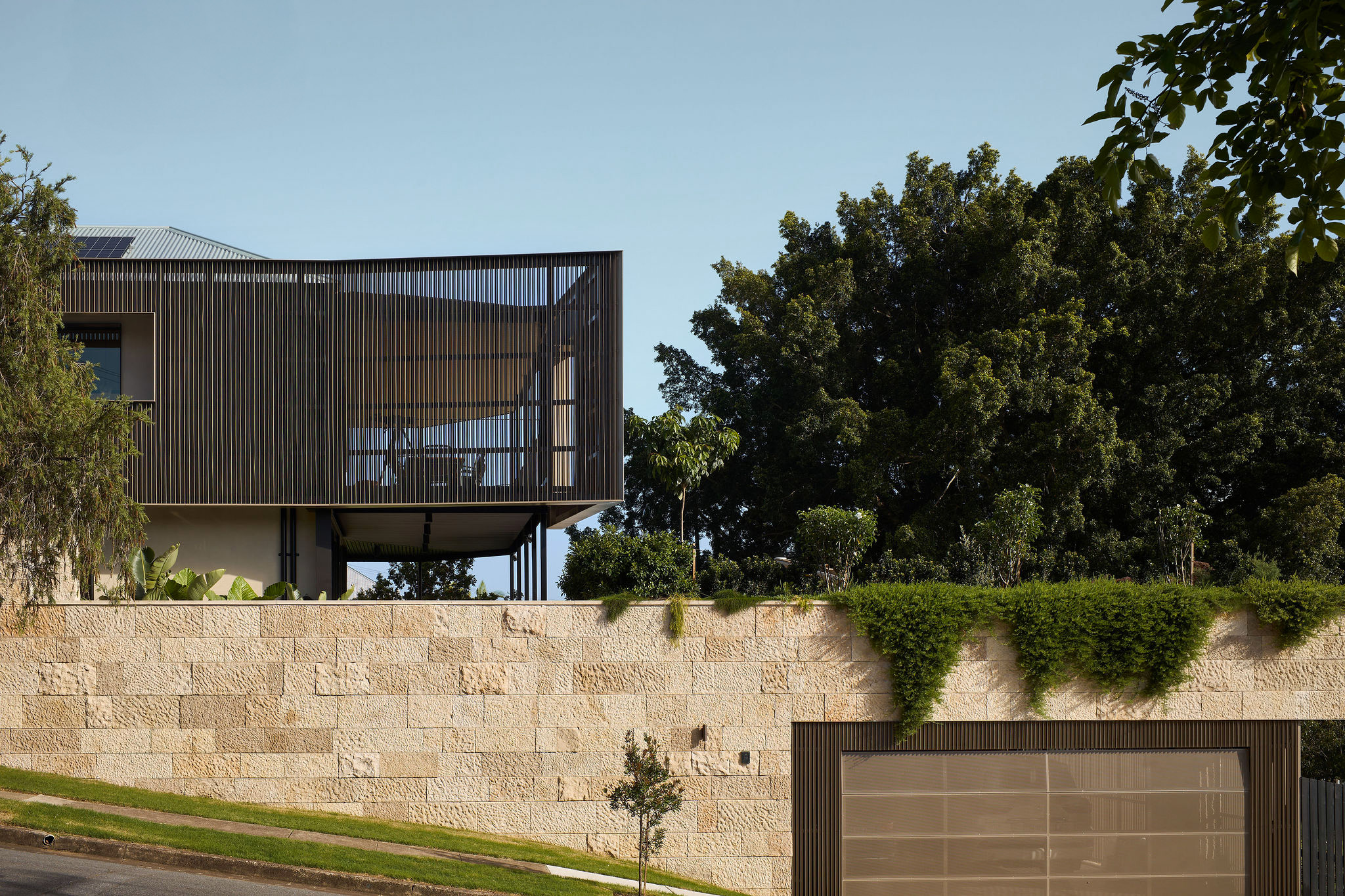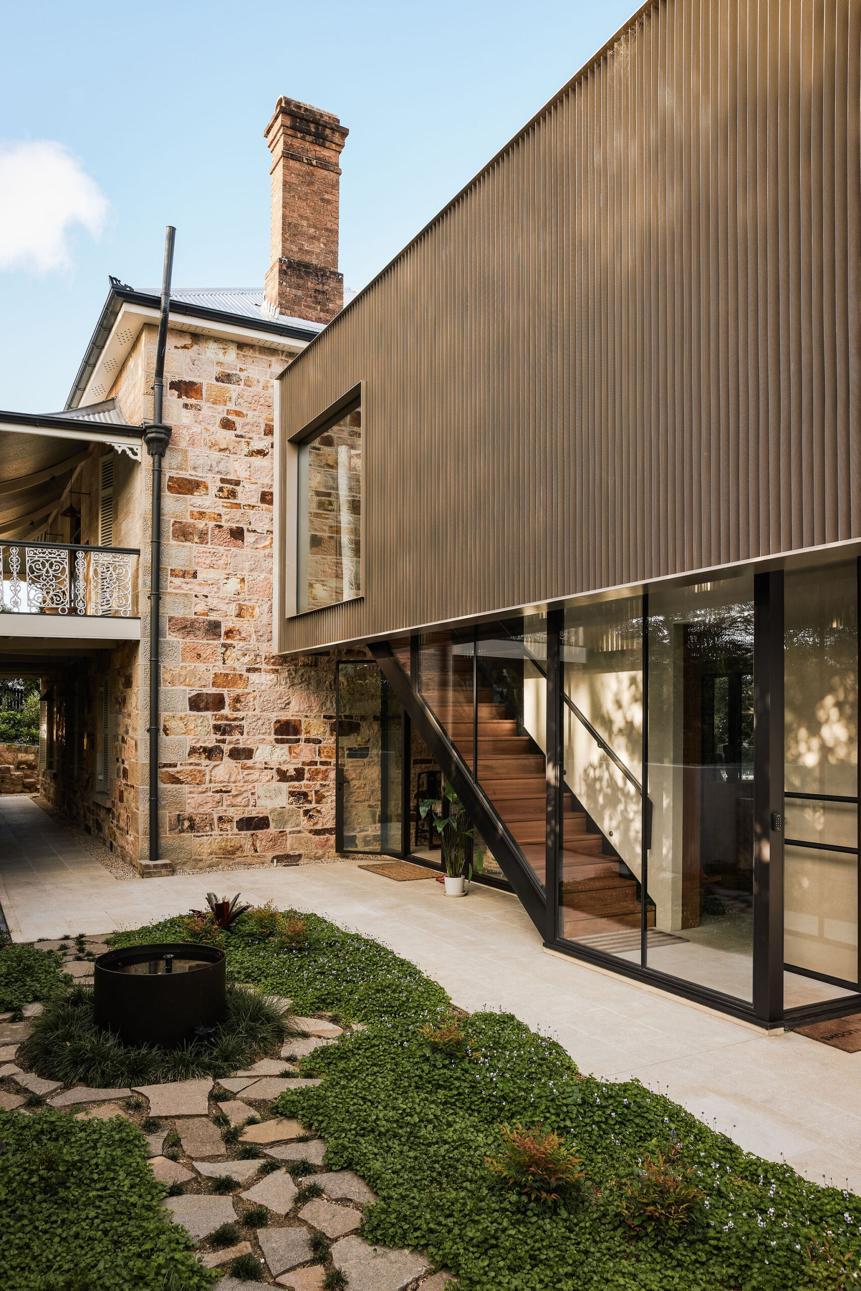 A continuous stone wall runs the length of the site, serving as both a visual buffer and a reference back to the timeless craftsmanship of the stone walls of the heritage home. The wall seamlessly melds with the landscape and integrates with planter beds that soften its solidity. Beyond mere functionality, it enriches the experience of both inhabitants and passersby.