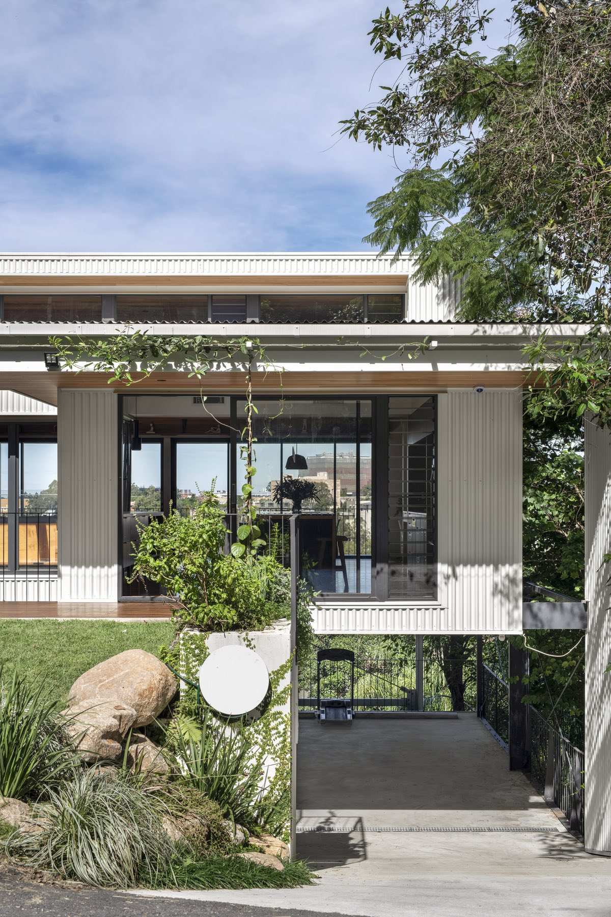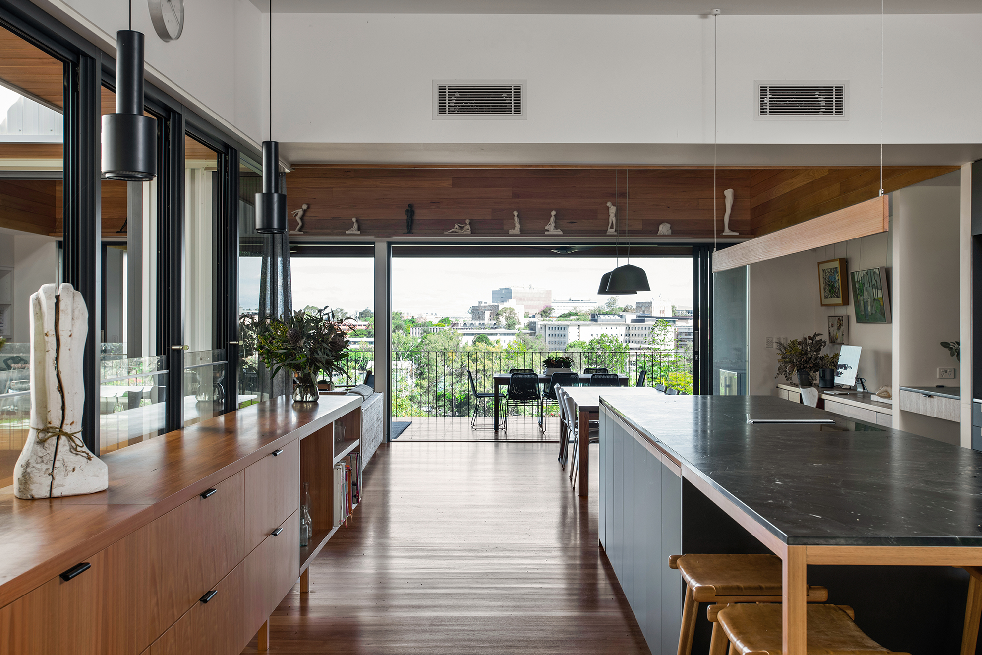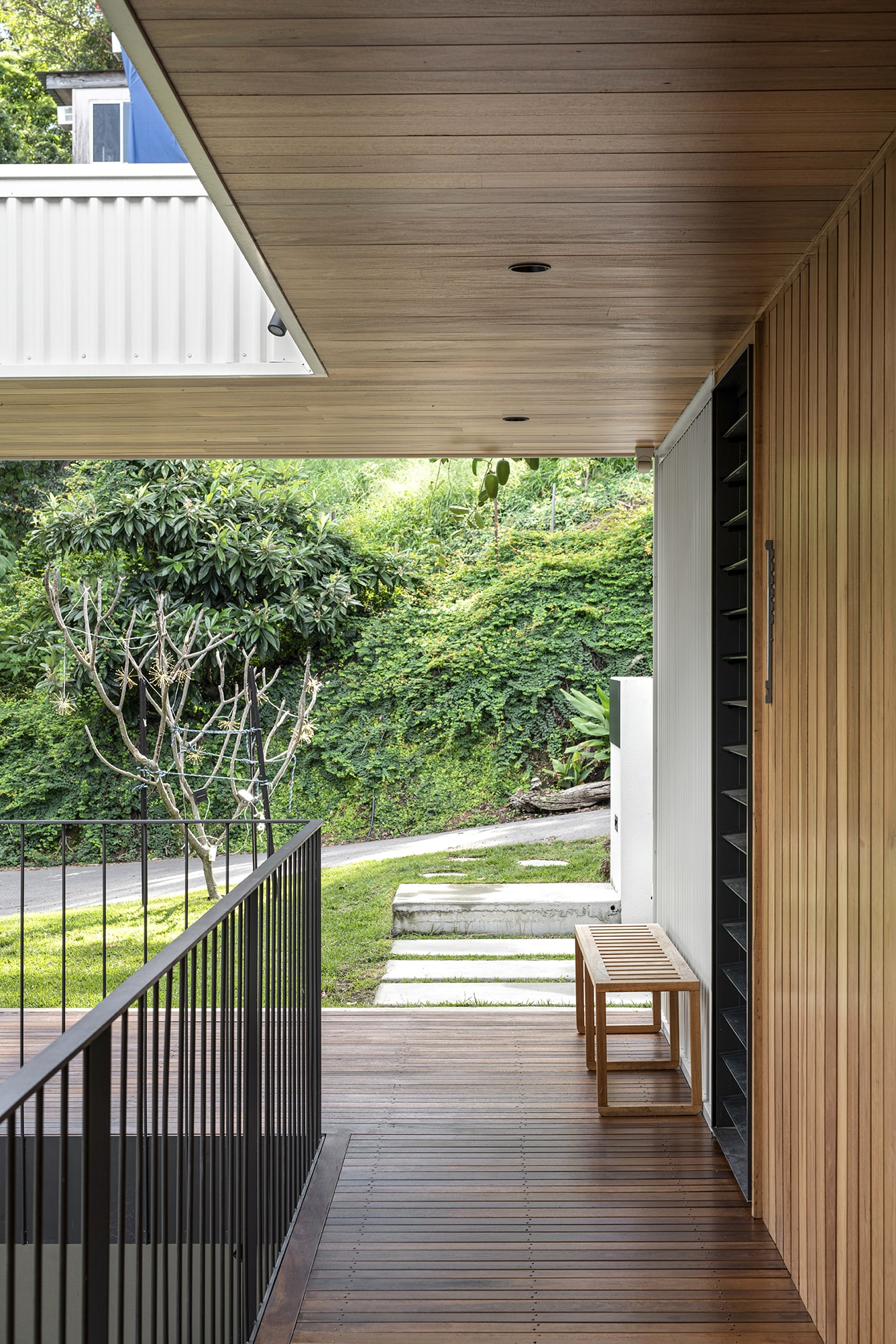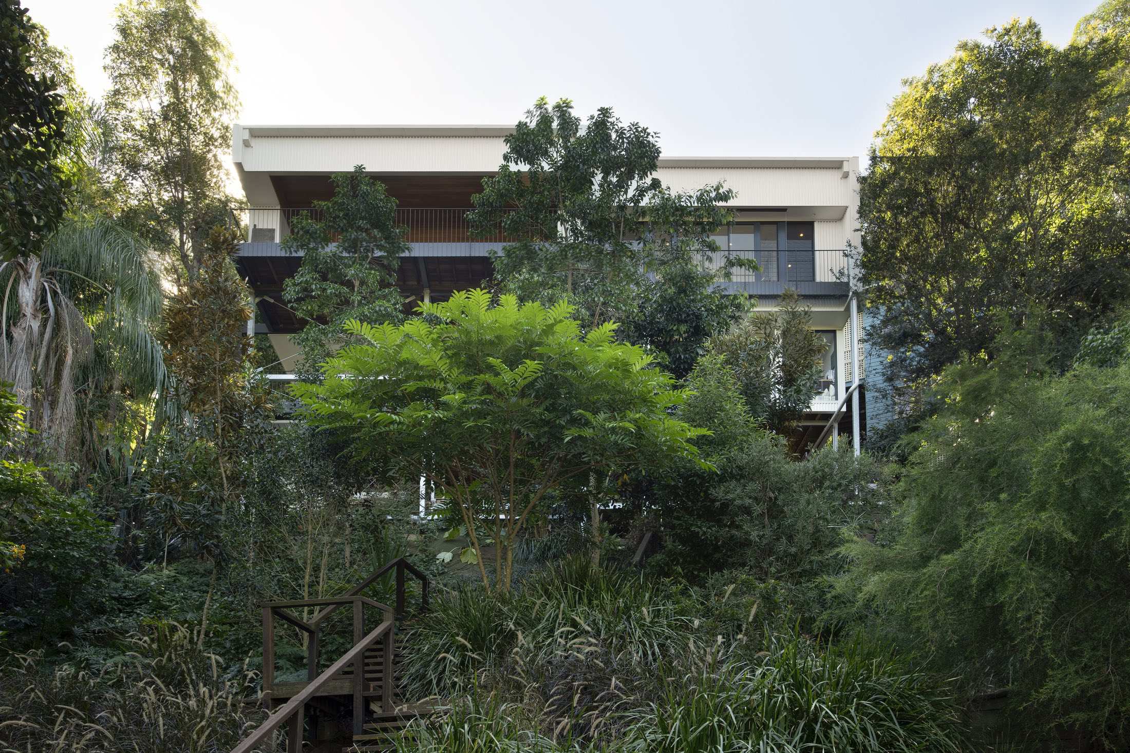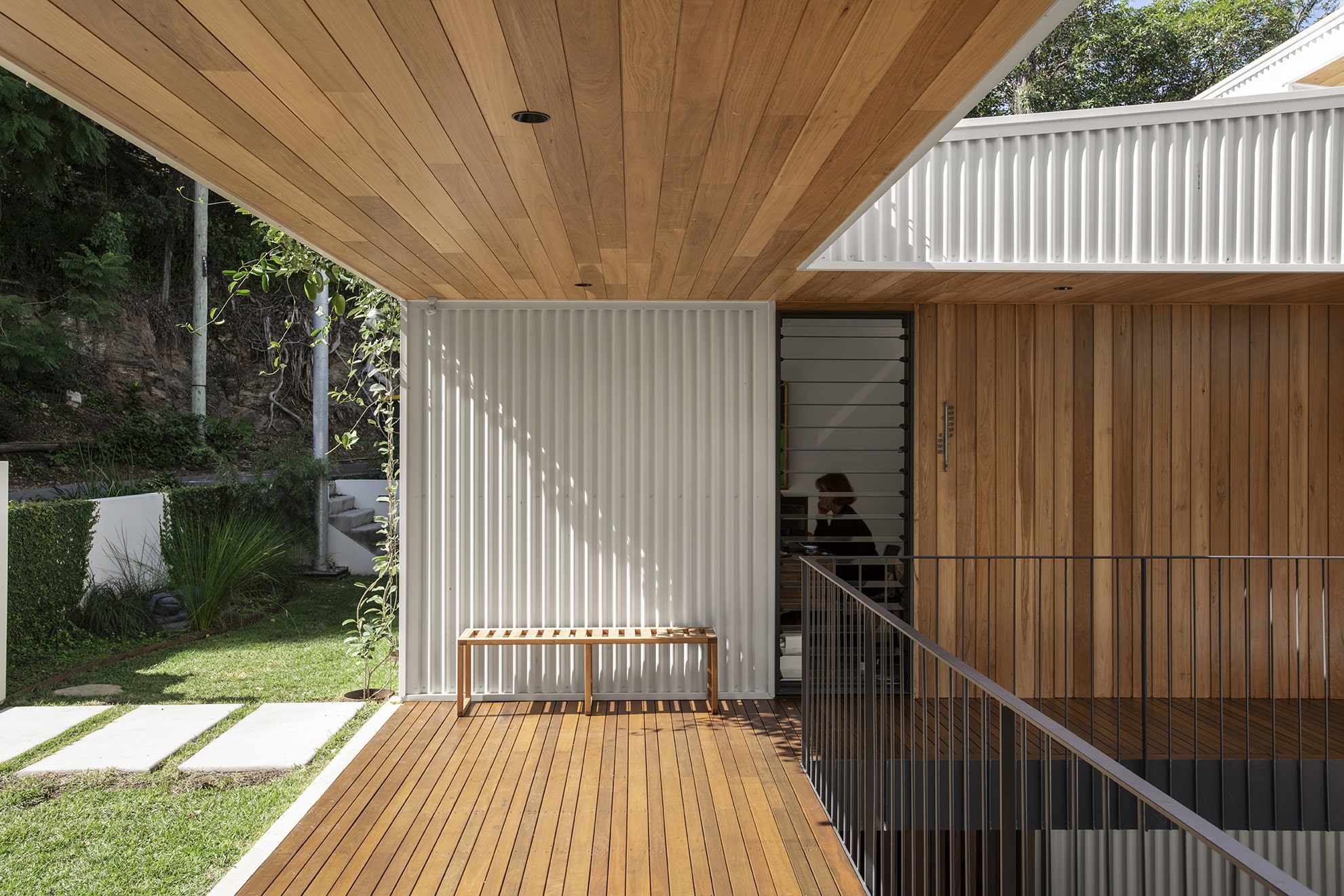 The house sits low to the ground and unassuming from its entrance — in line with the surrounding streetscape. However, upon entry, the views out to the Brisbane River are exposed and occupants are invited to step down into the lower level. Here, two bedrooms have been designed for the family’s teenagers.