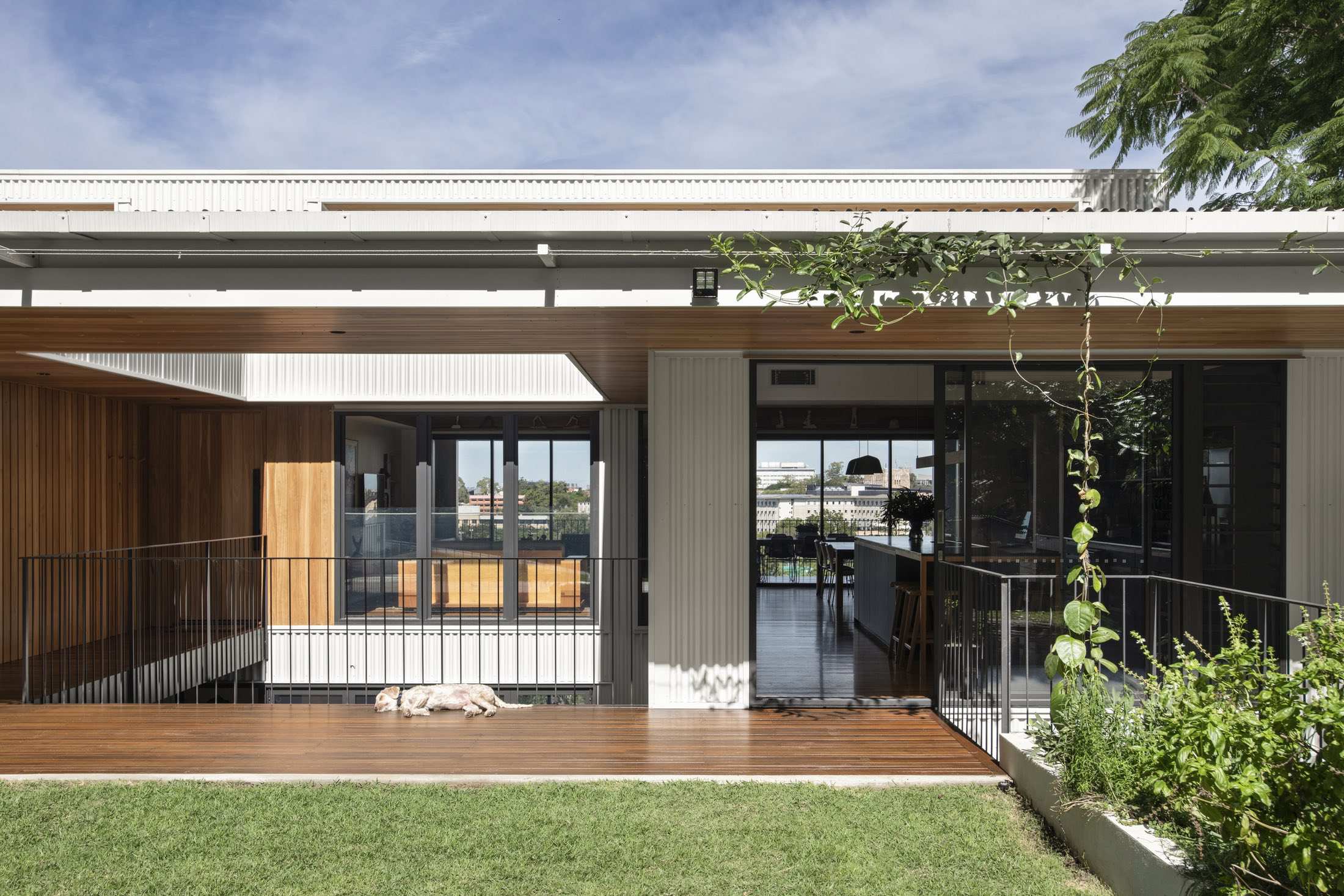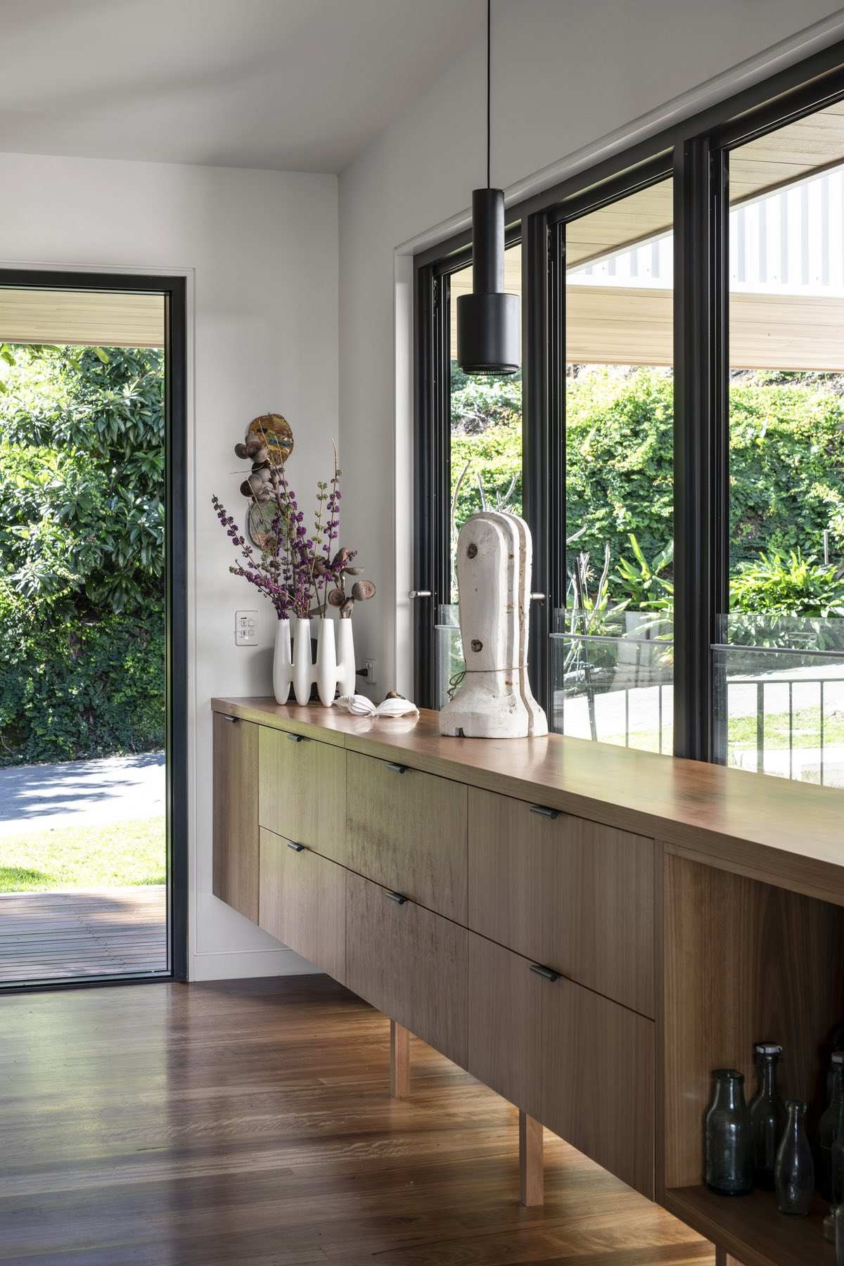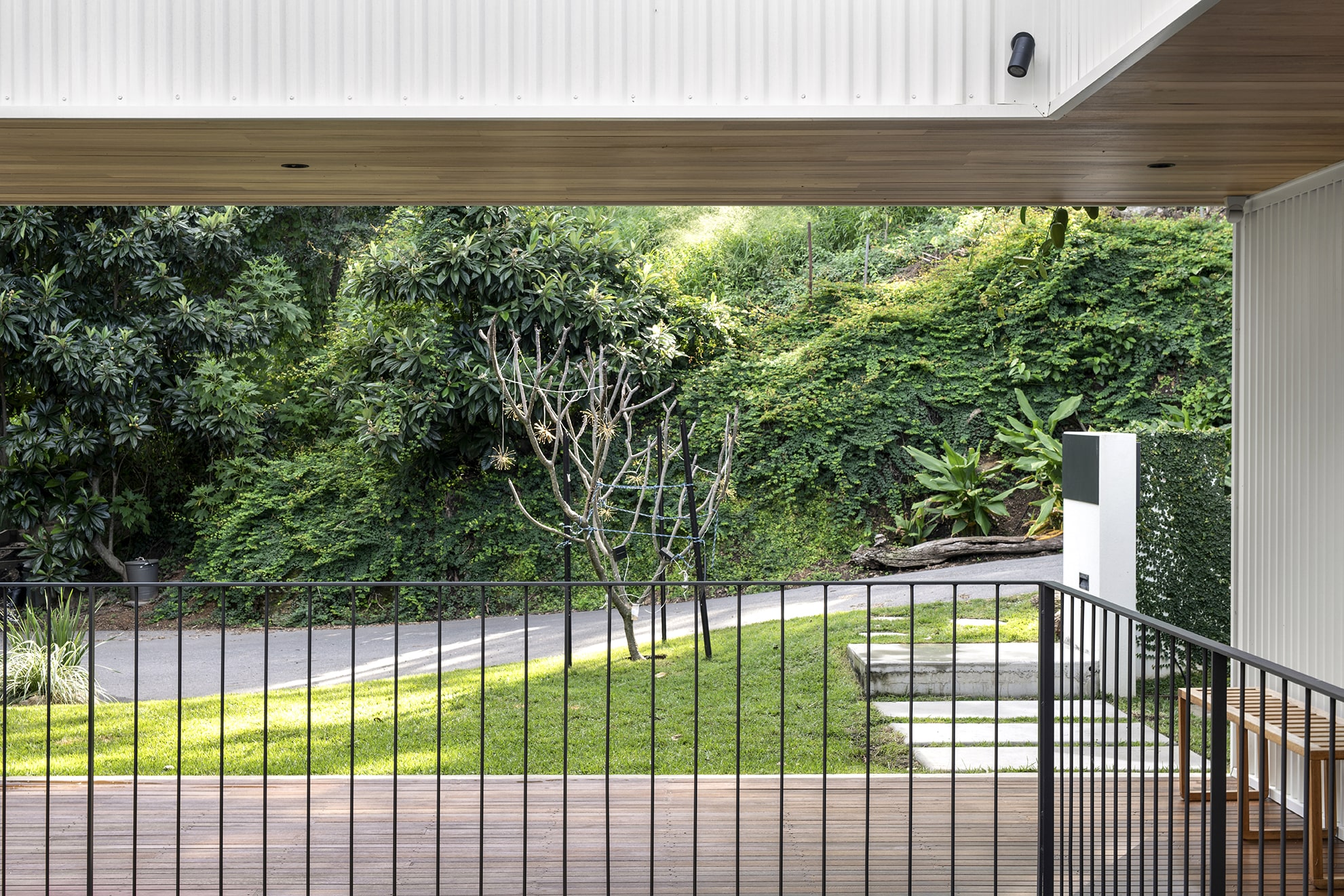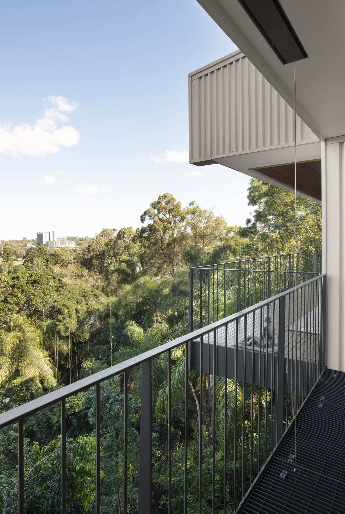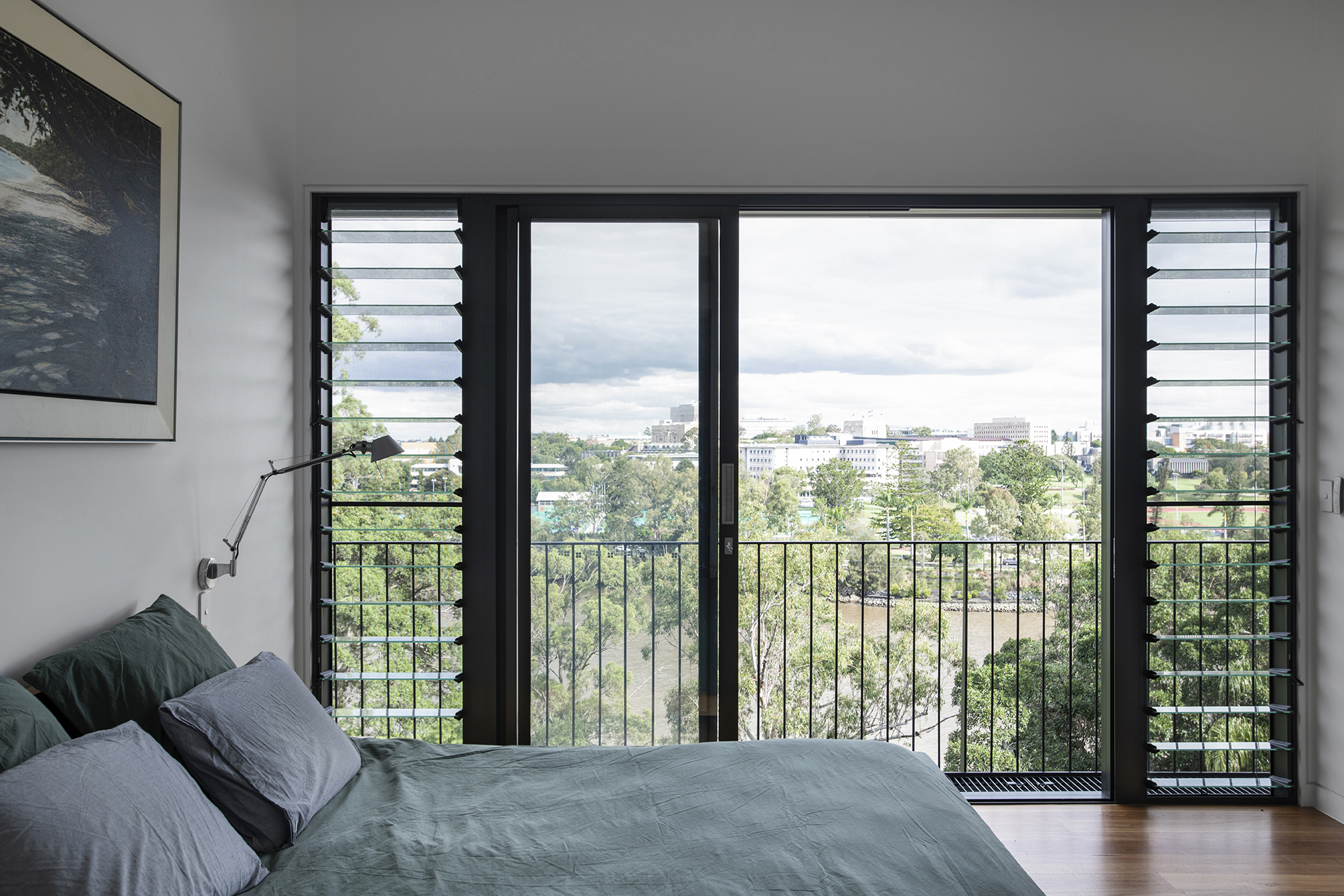 The house sits low to the ground and unassuming from its entrance — in line with the surrounding streetscape. However, upon entry, the views out to the Brisbane River are exposed and occupants are invited to step down into the lower level. Here, two bedrooms have been designed for the family’s teenagers.
