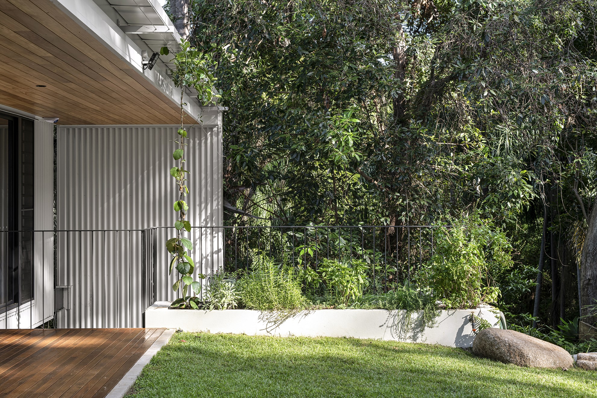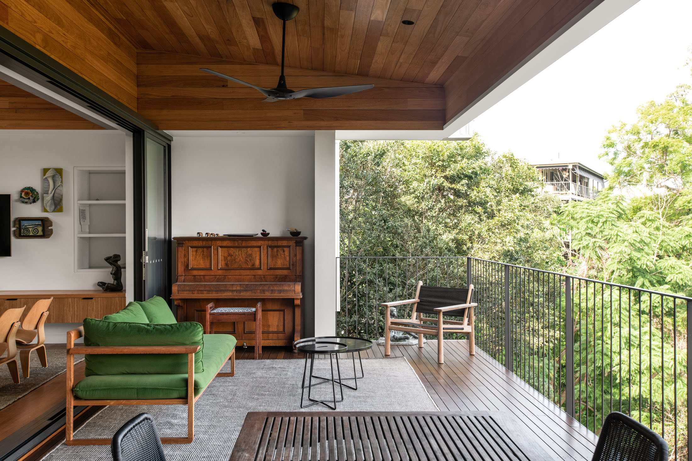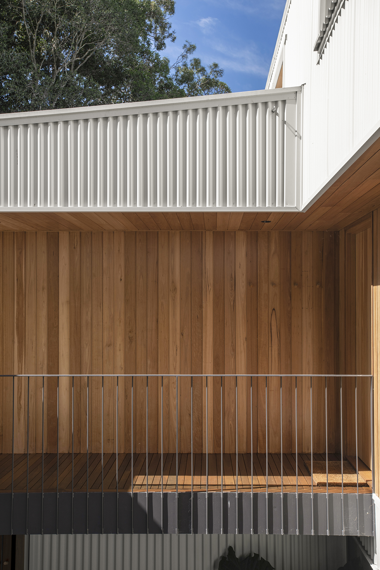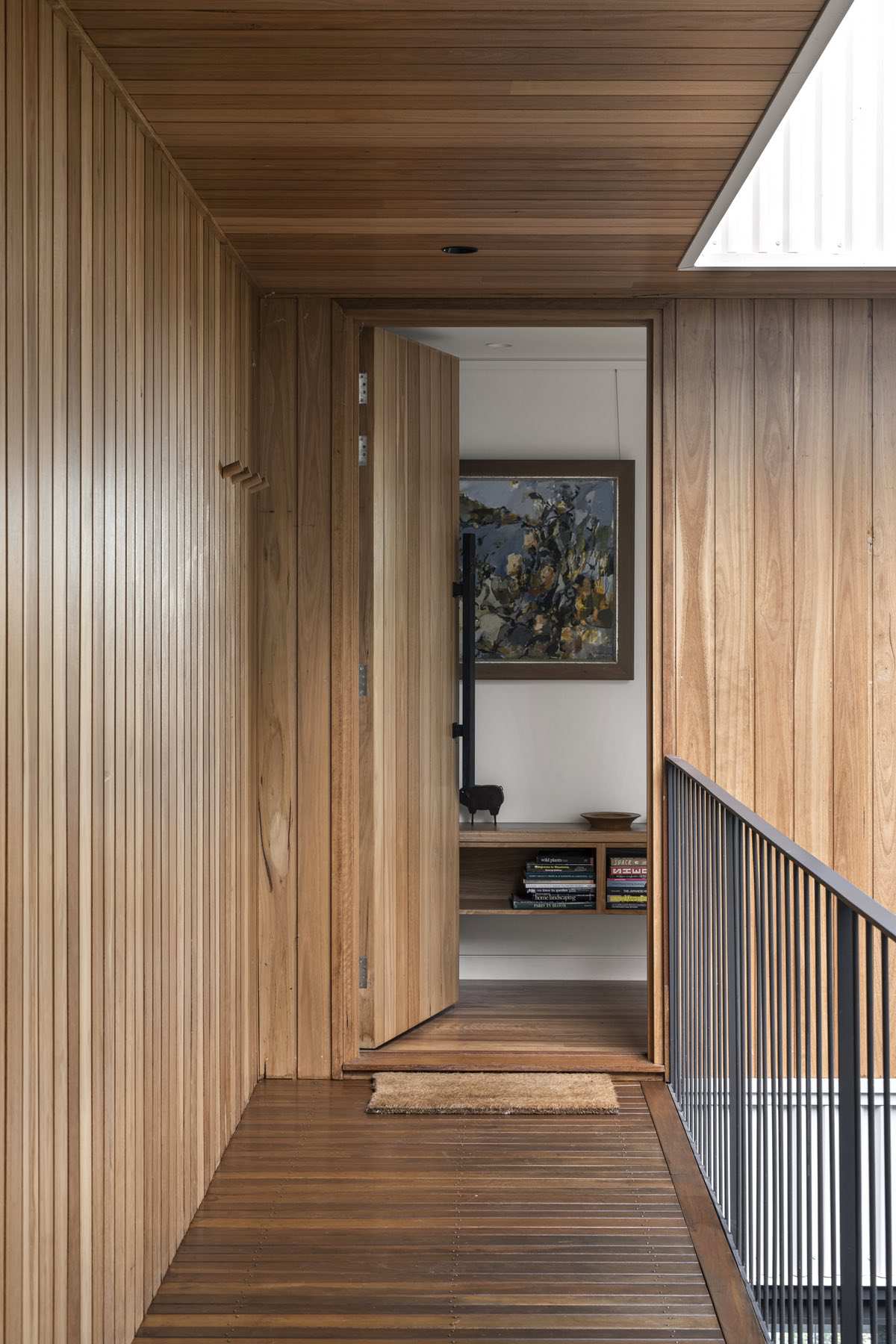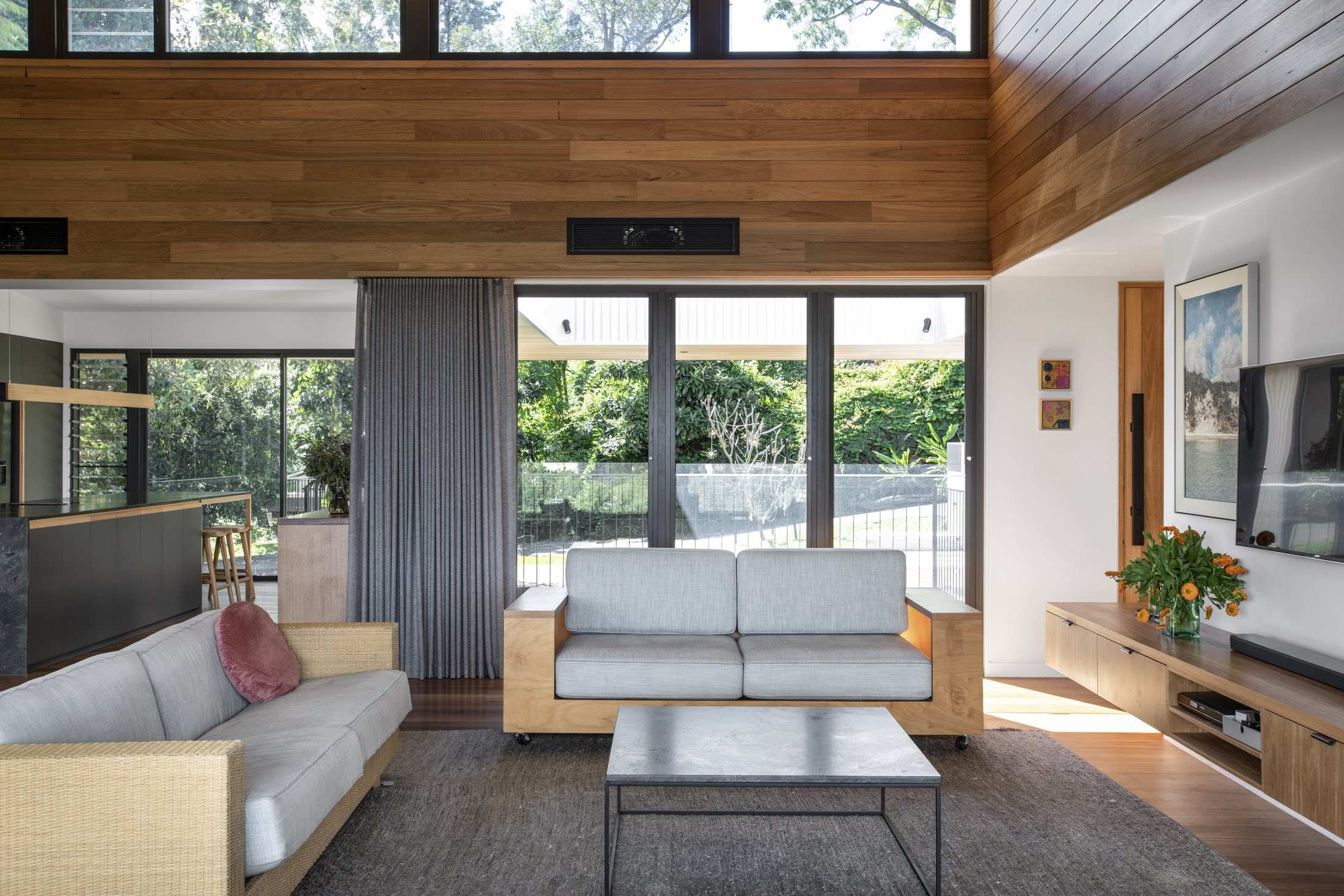 The house sits low to the ground and unassuming from its entrance — in line with the surrounding streetscape. However, upon entry, the views out to the Brisbane River are exposed and occupants are invited to step down into the lower level. Here, two bedrooms have been designed for the family’s teenagers.