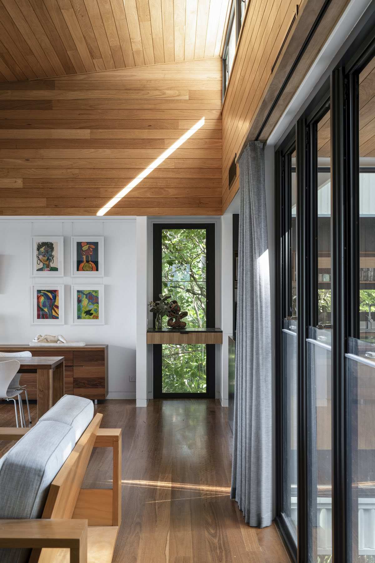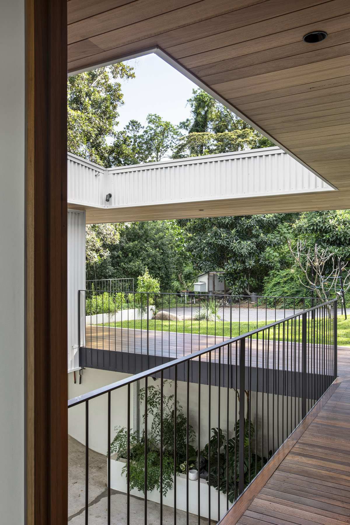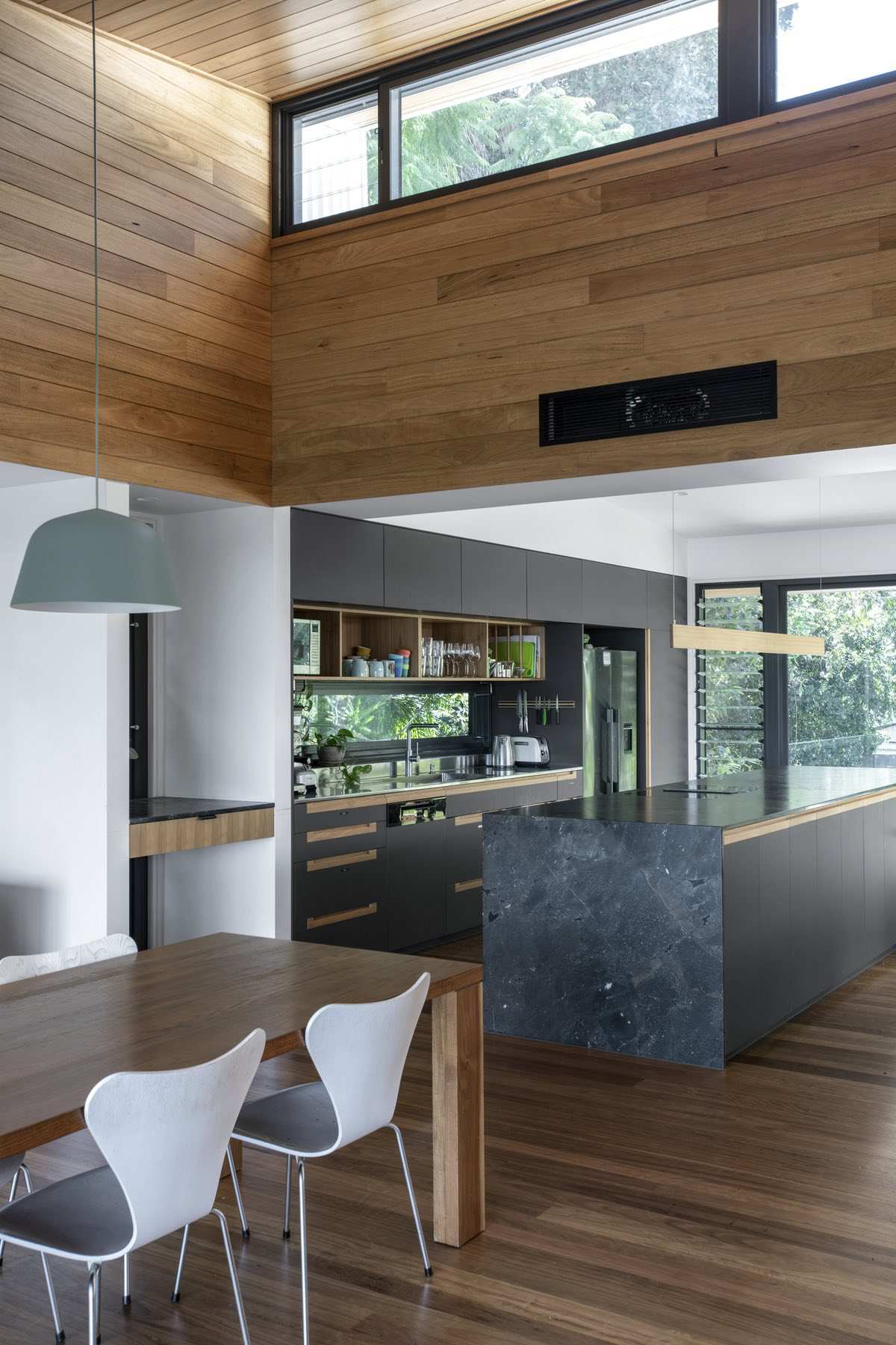The design comprises two storeys, four bedrooms and a large, open-plan living/dining area. Interiors are flooded with natural light thanks to clerestory windows and a generous void that promotes cross-ventilation to all rooms in the house.