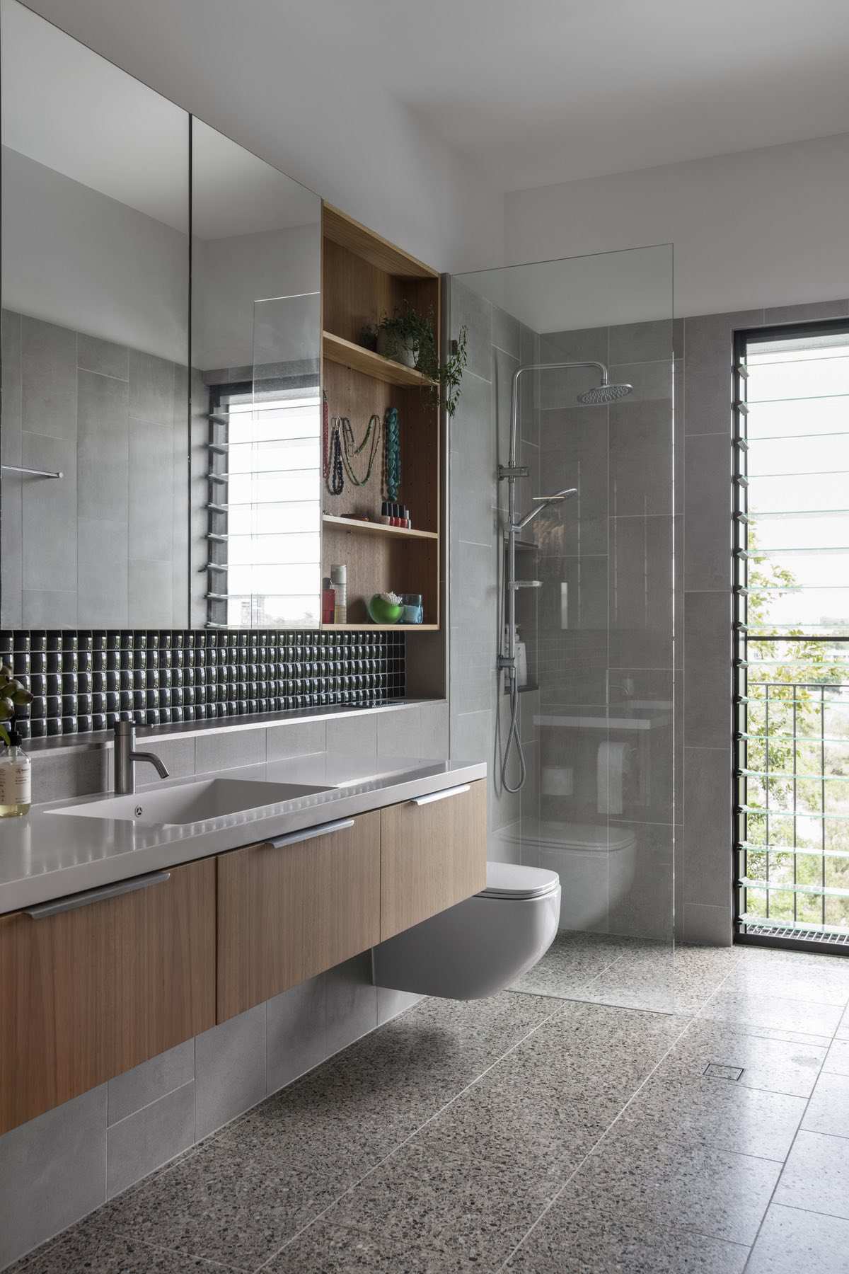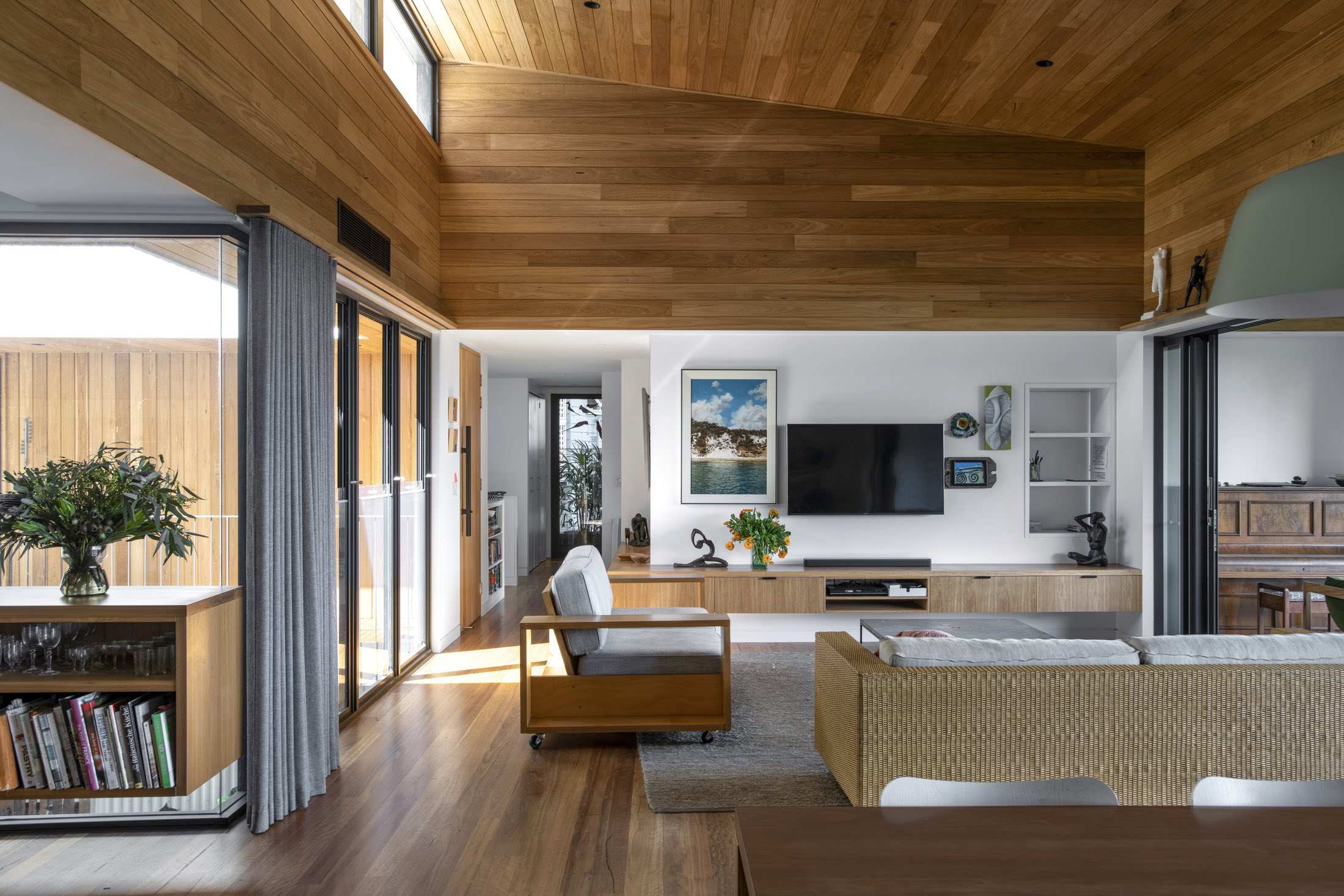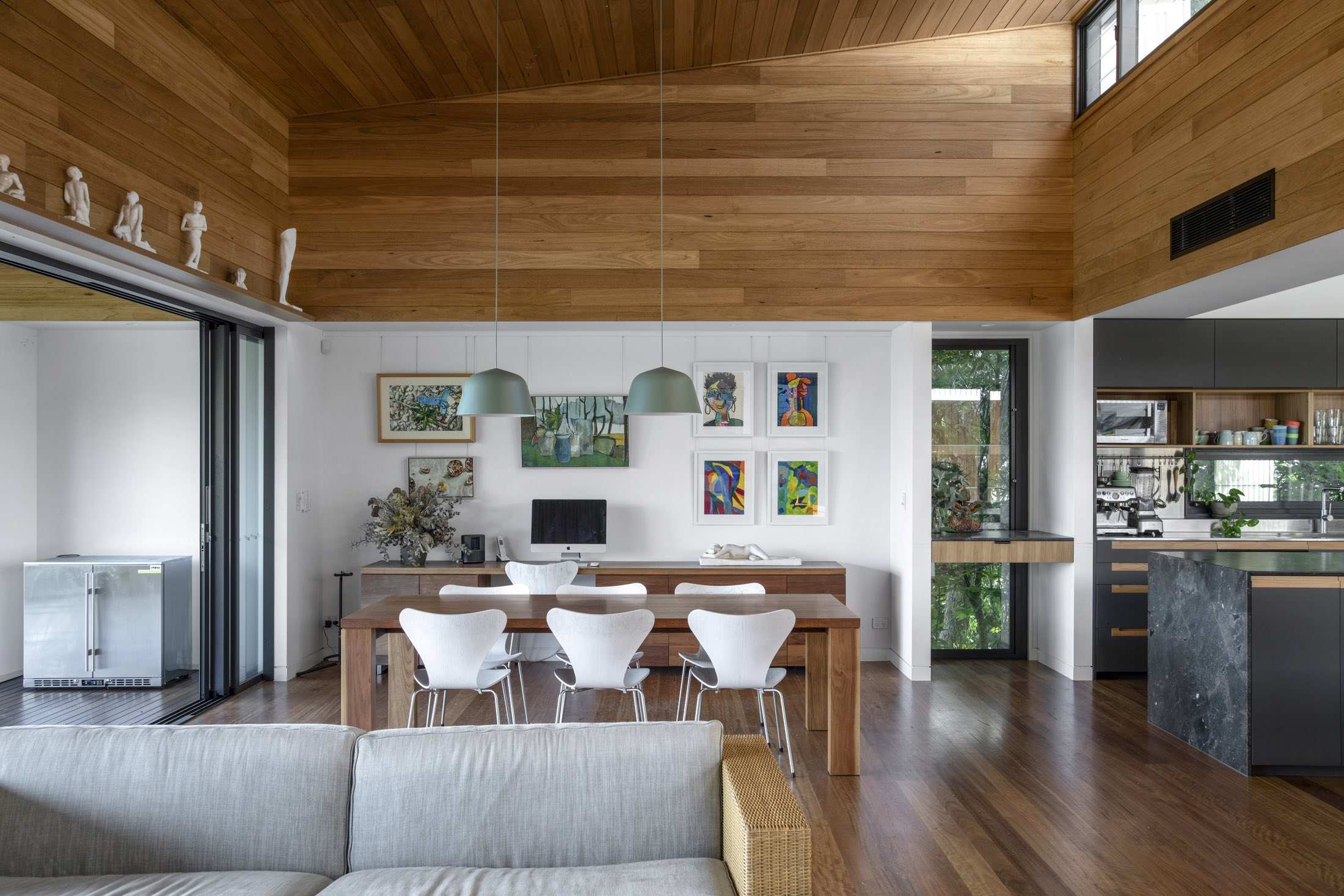 The design comprises two storeys, four bedrooms and a large, open-plan living/dining area. Interiors are flooded with natural light thanks to clerestory windows and a generous void that promotes cross-ventilation to all rooms in the house.