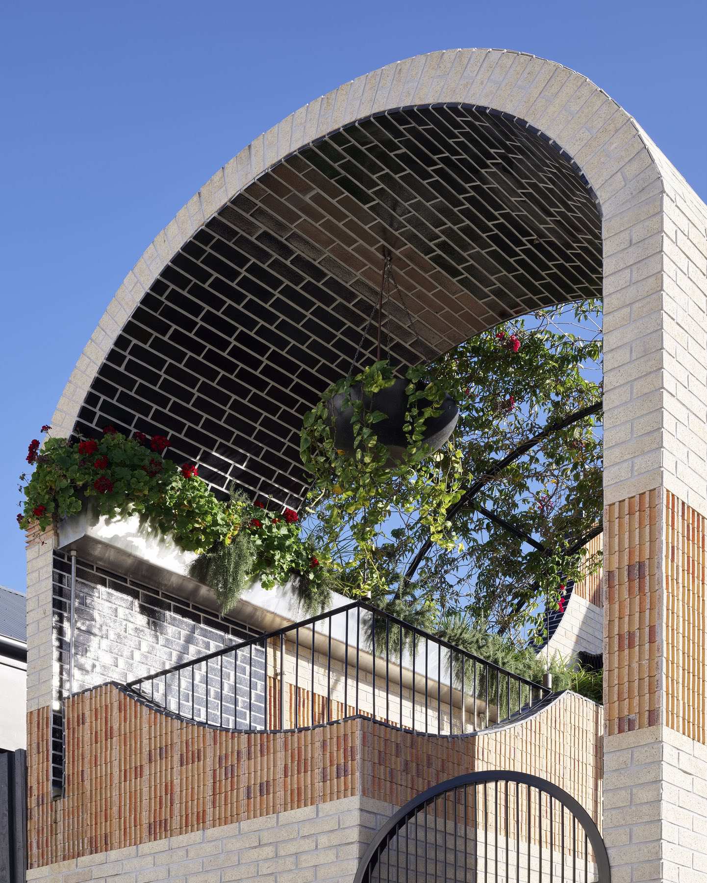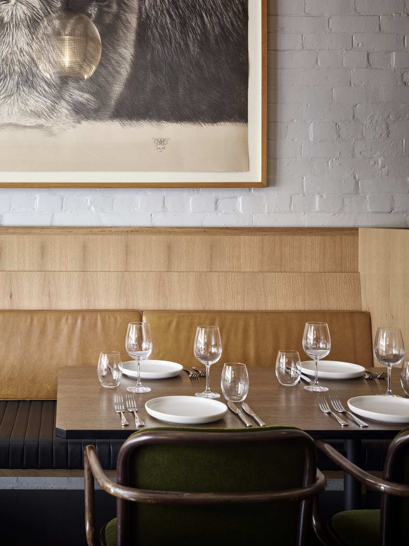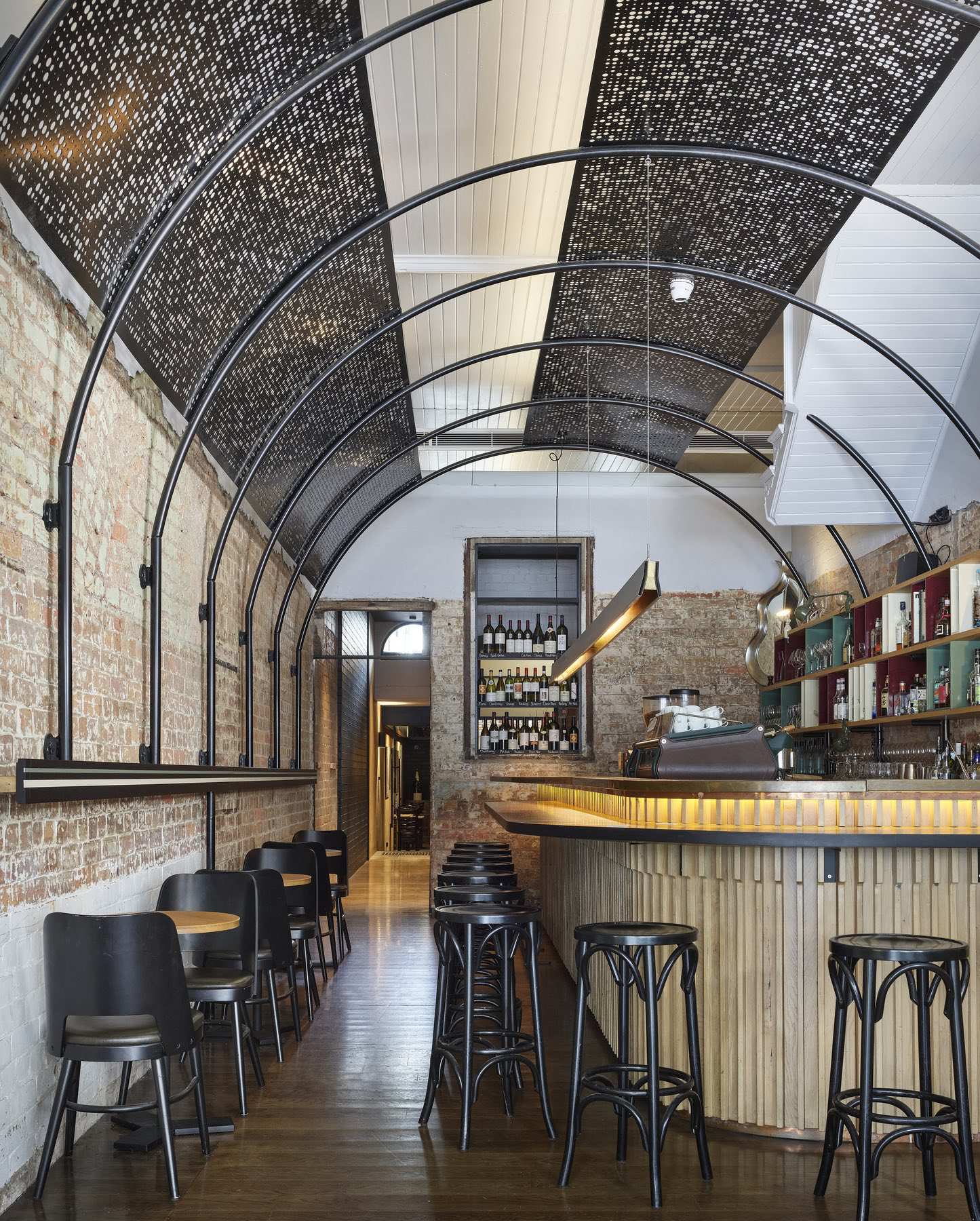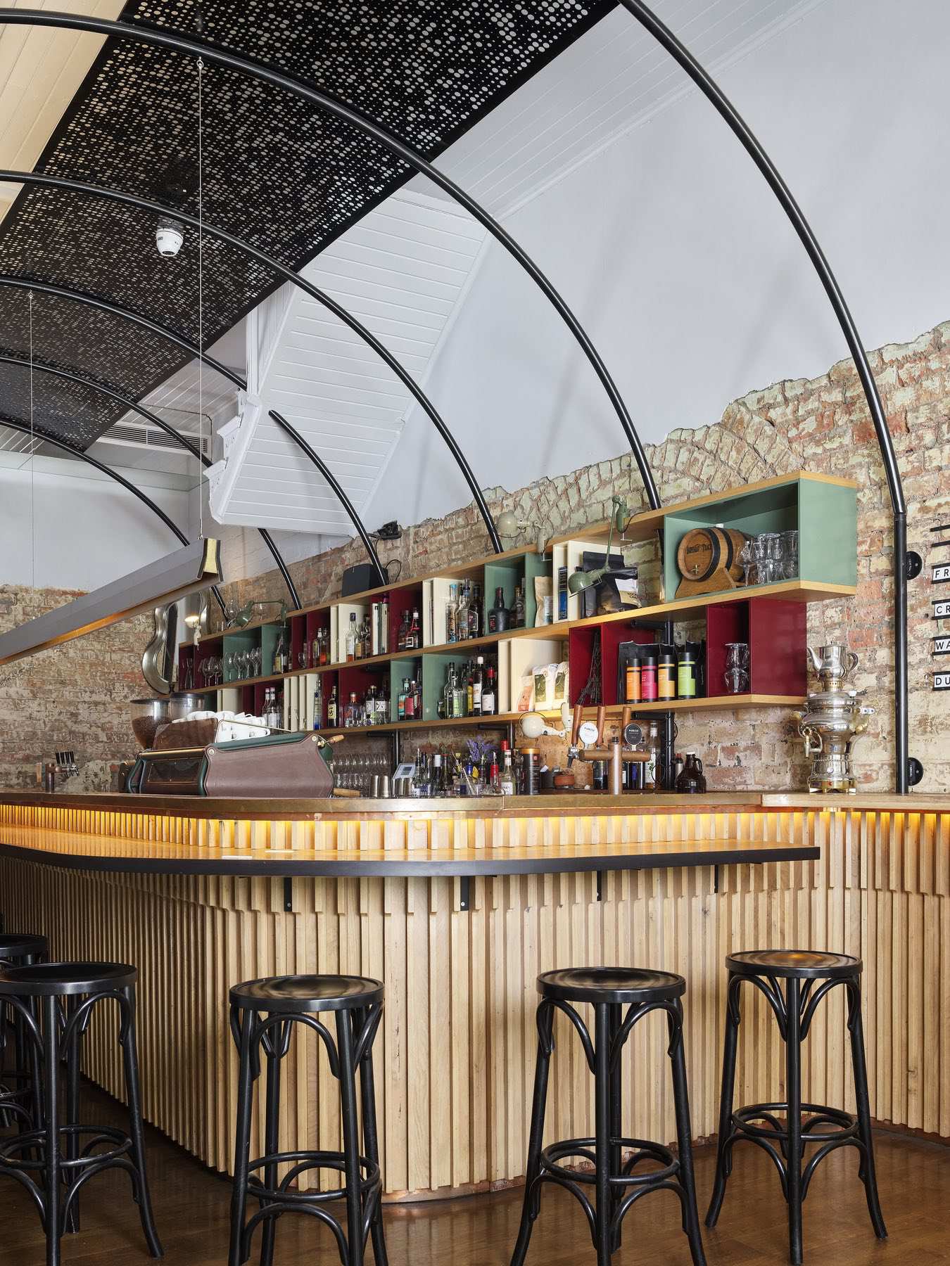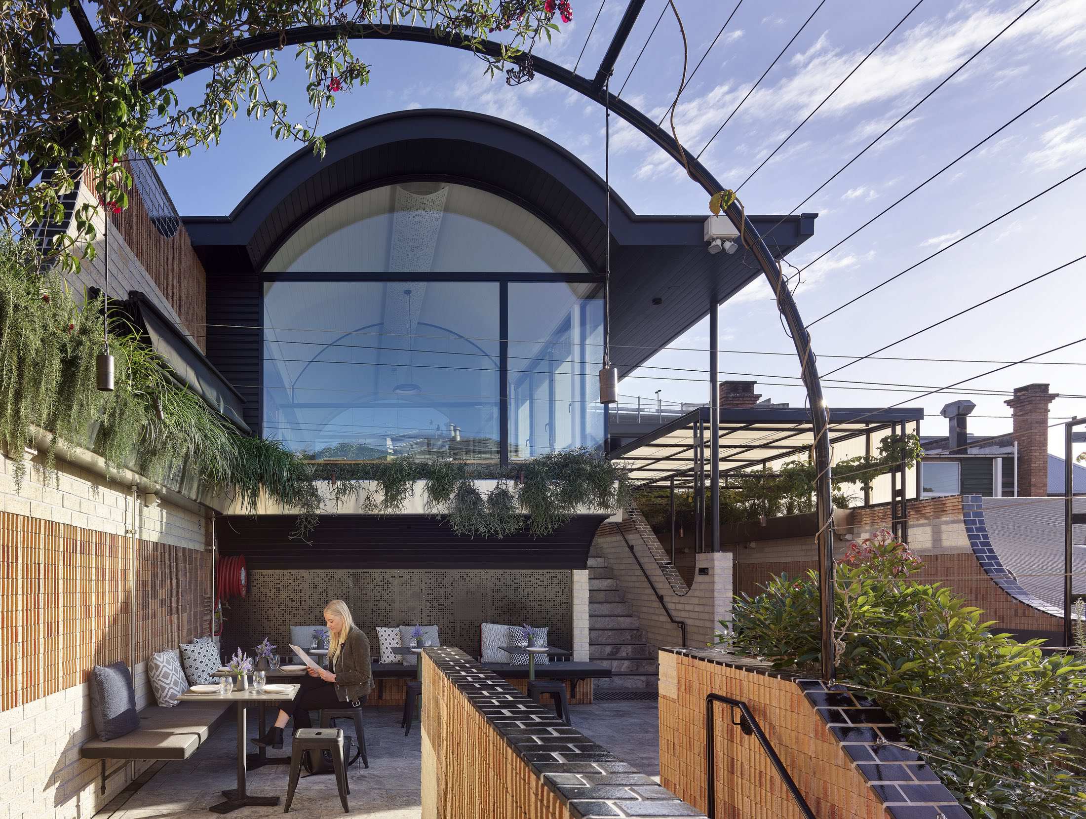 Inside, the original tongue-and-groove timber ceilings and sandstone and brick walls were lovingly repaired and restored. Meanwhile, the installation of an arched frame over the bar allowed us to add lighting without compromising original building materials. Outside, a new terrace marries ‘old’ and ‘new’ thanks to the use of patterned bricks in shades and shapes that tie in with the hues and patterns found throughout the neighbourhood — particularly at the nearby Mater Hospital.