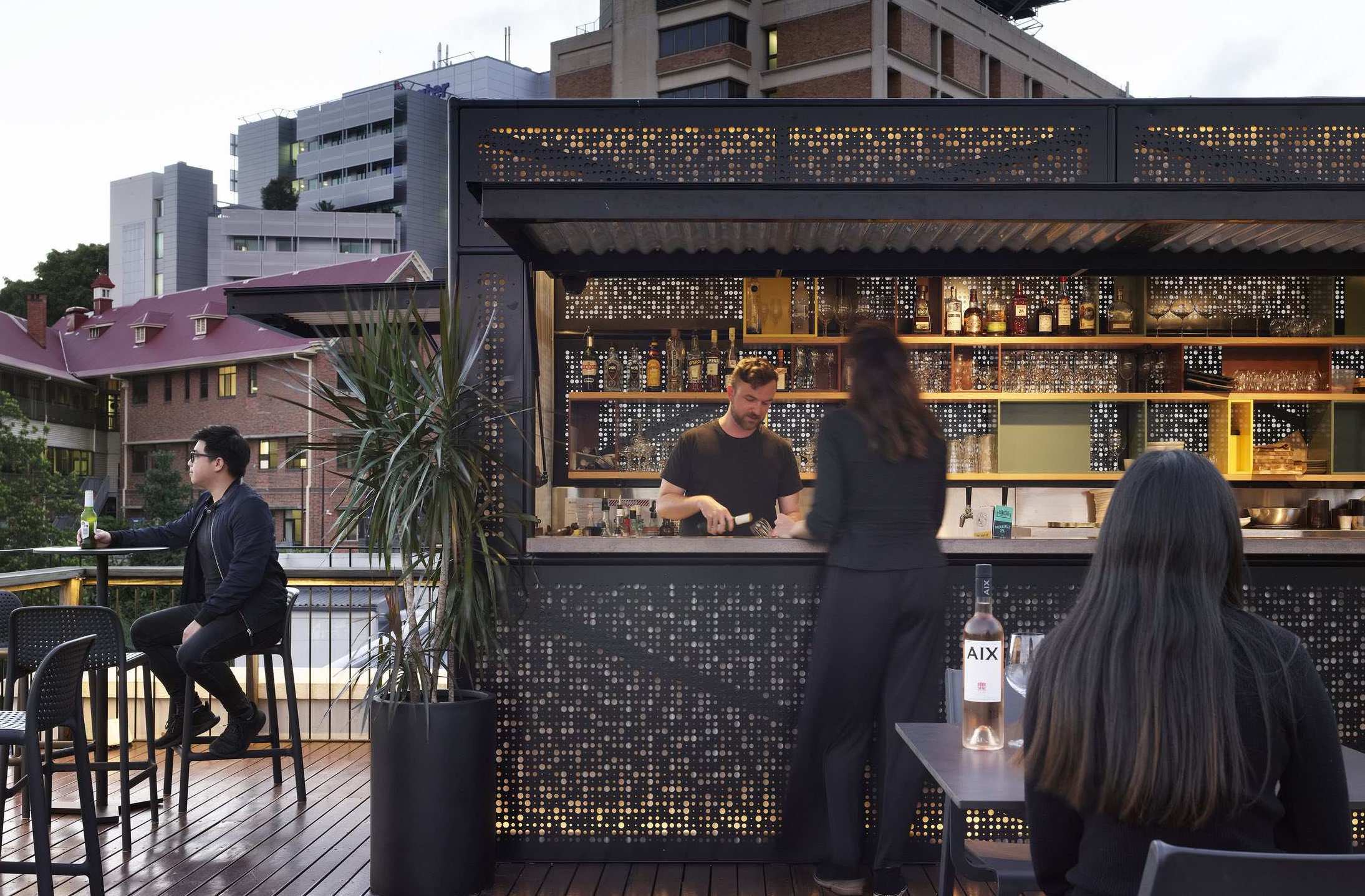 To create the new Le Bon Bar, we designed a structure to sit atop the heritage walls of the existing building. This structure is perched on a platform that is supported on a series of legs that carefully attach to the existing heritage walls. Due to access restrictions, we deployed laser scanning to precisely measure the space, then worked closely with engineers to design balustrading, stair access, guttering, and provisions for power and waste removal. The design enables the bar to be inconspicuous from the street, in order to not obscure the design of the original façade.