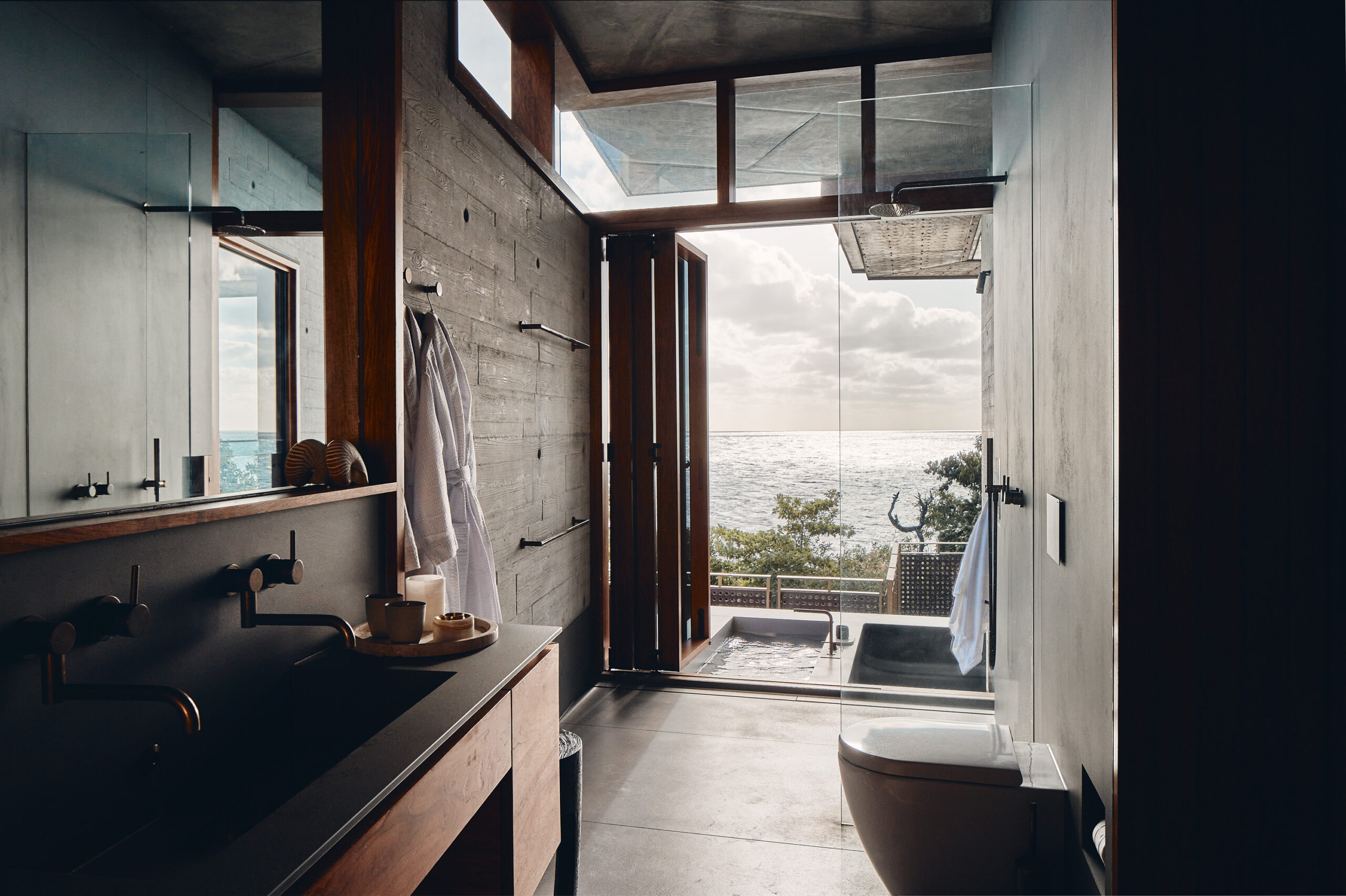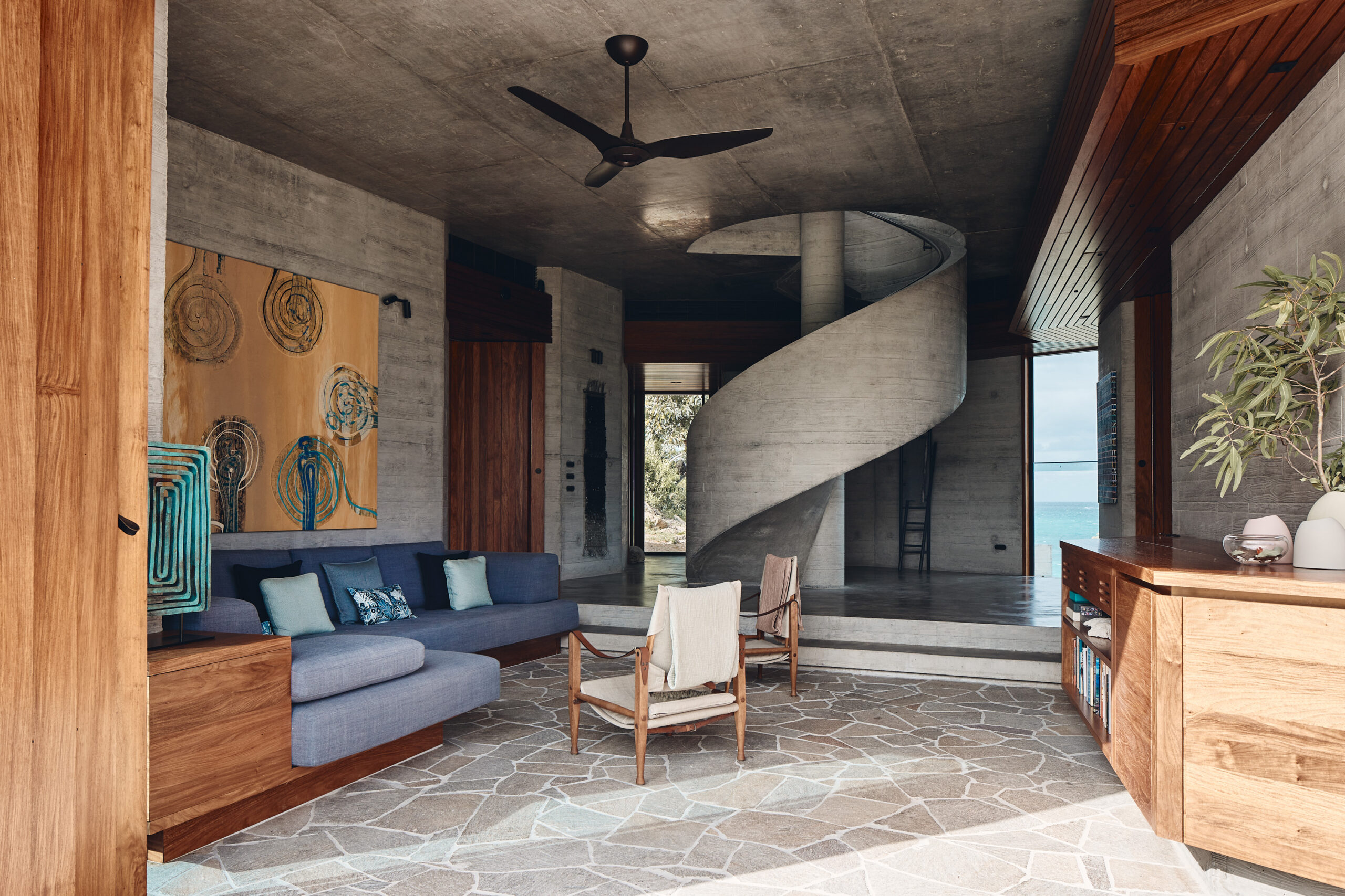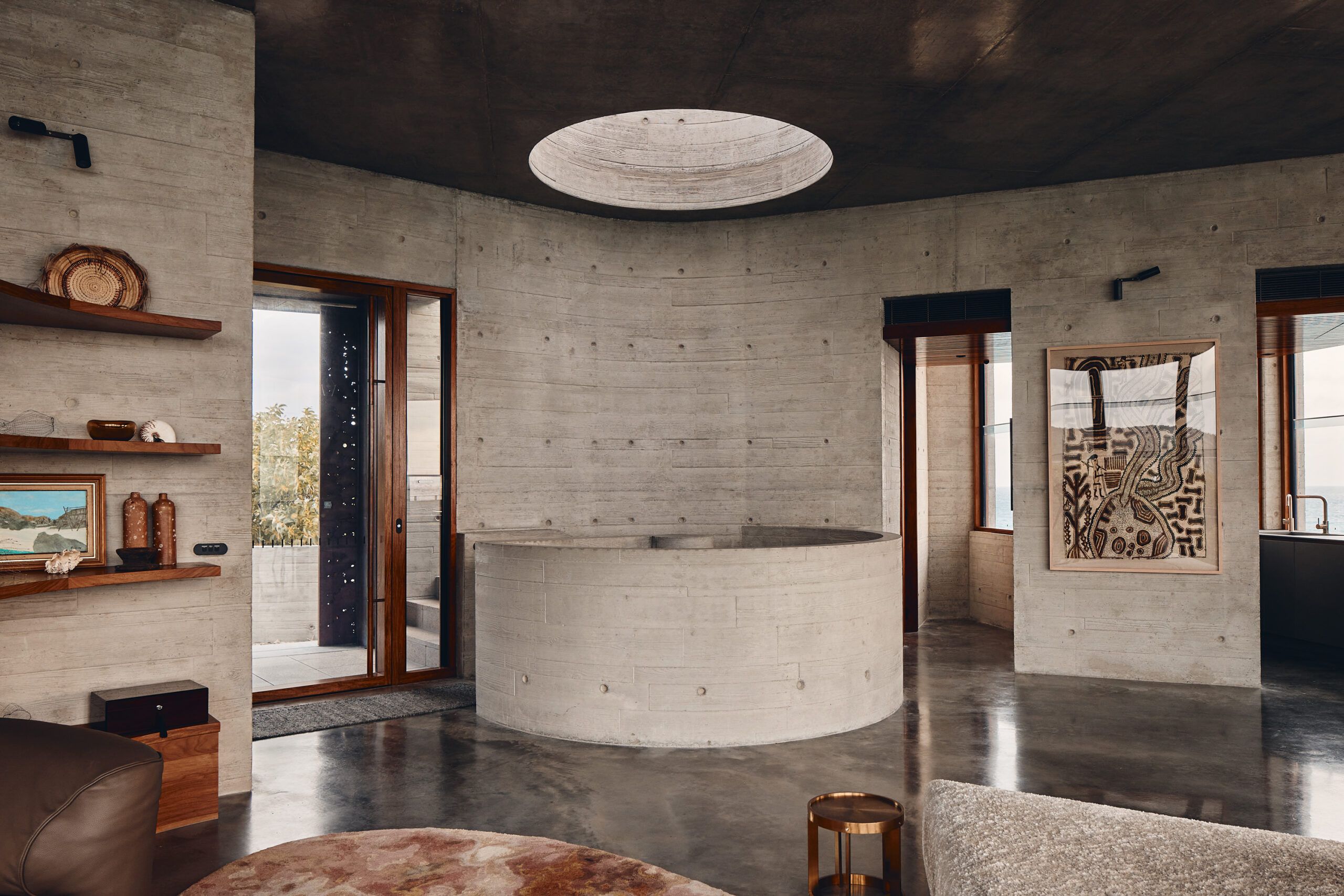 A central, curved stairwell acts as the heart of The House and provides a seamless connection between levels. Gaze skywards as you climb the stairs and an Oculus for tracking the patterns of the sun and the moon. A roof terrace and spa cap off The House and offer 360 degree views of the landscape. Internally, all three bedrooms have been individually designed to frame vistas to nearby and distant places of significance. The top-floor bedroom frames views of Cooks Look, while bedrooms on the ground level look towards Hibiscus and Attenborough Beach respectively.