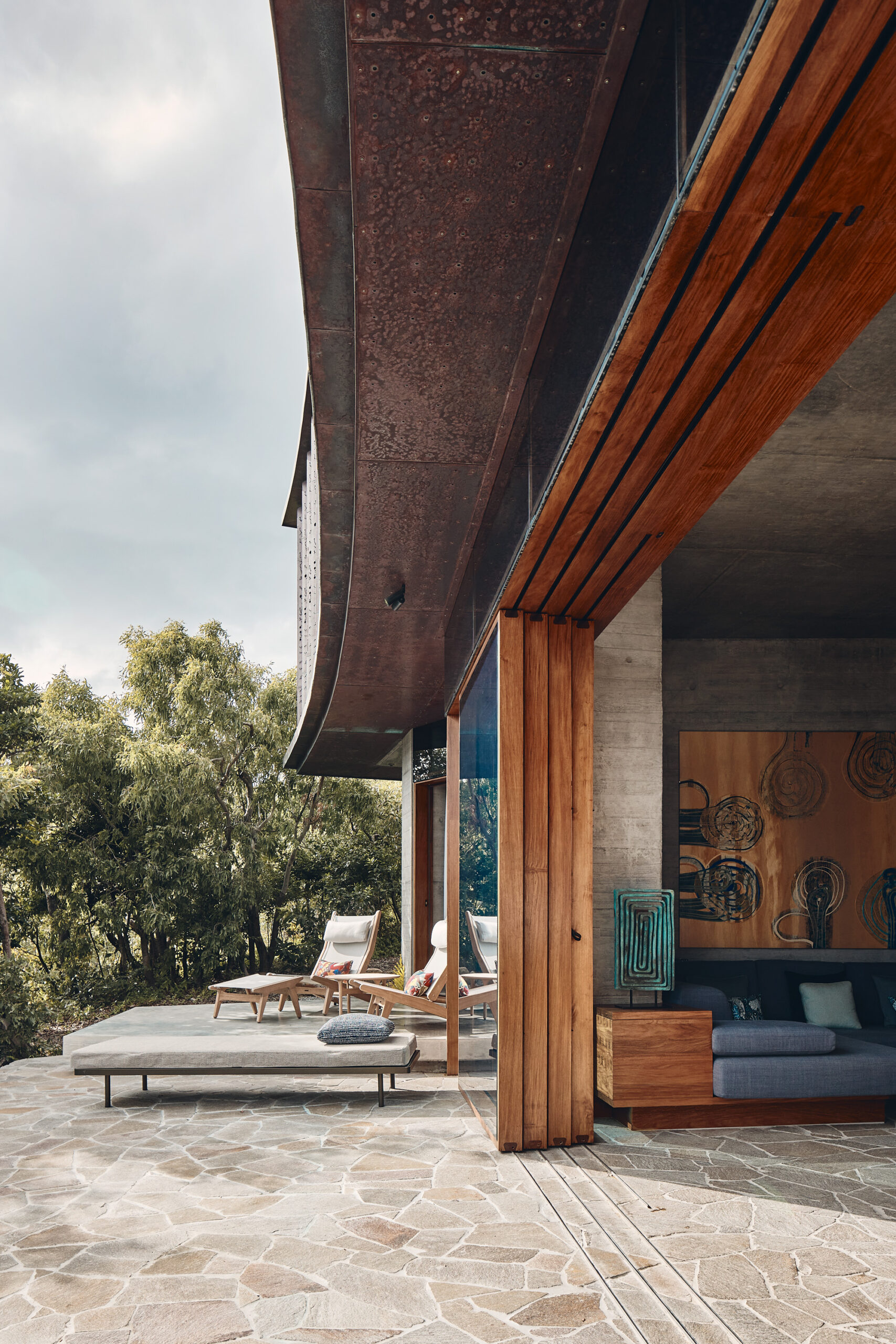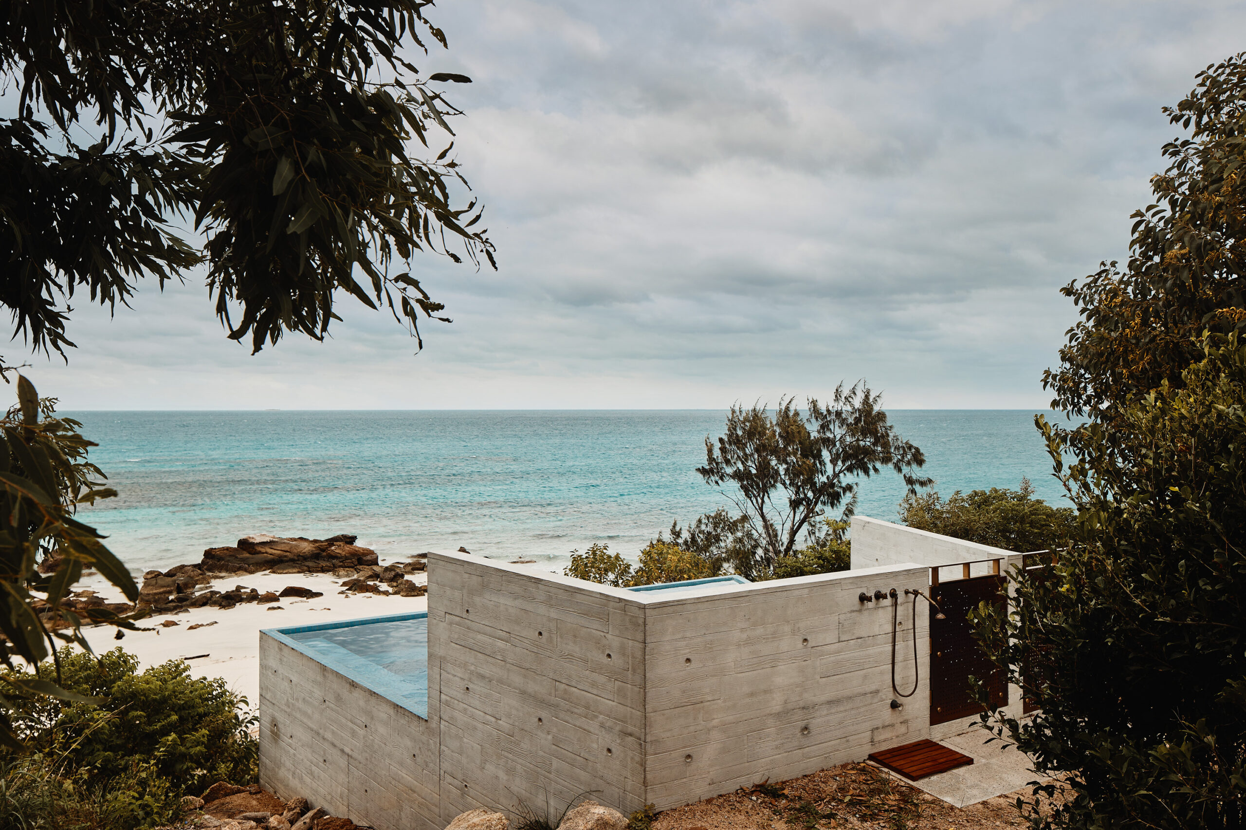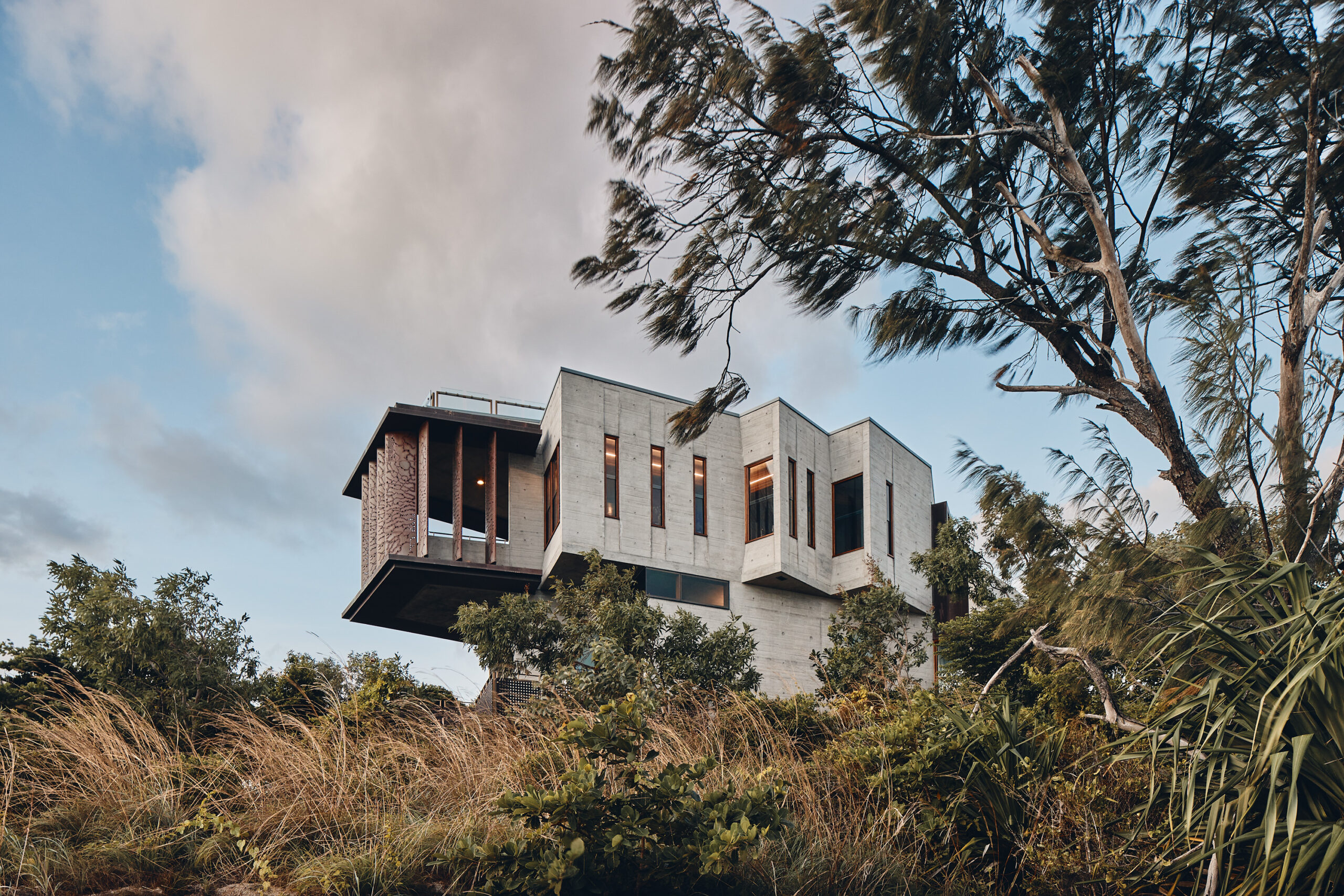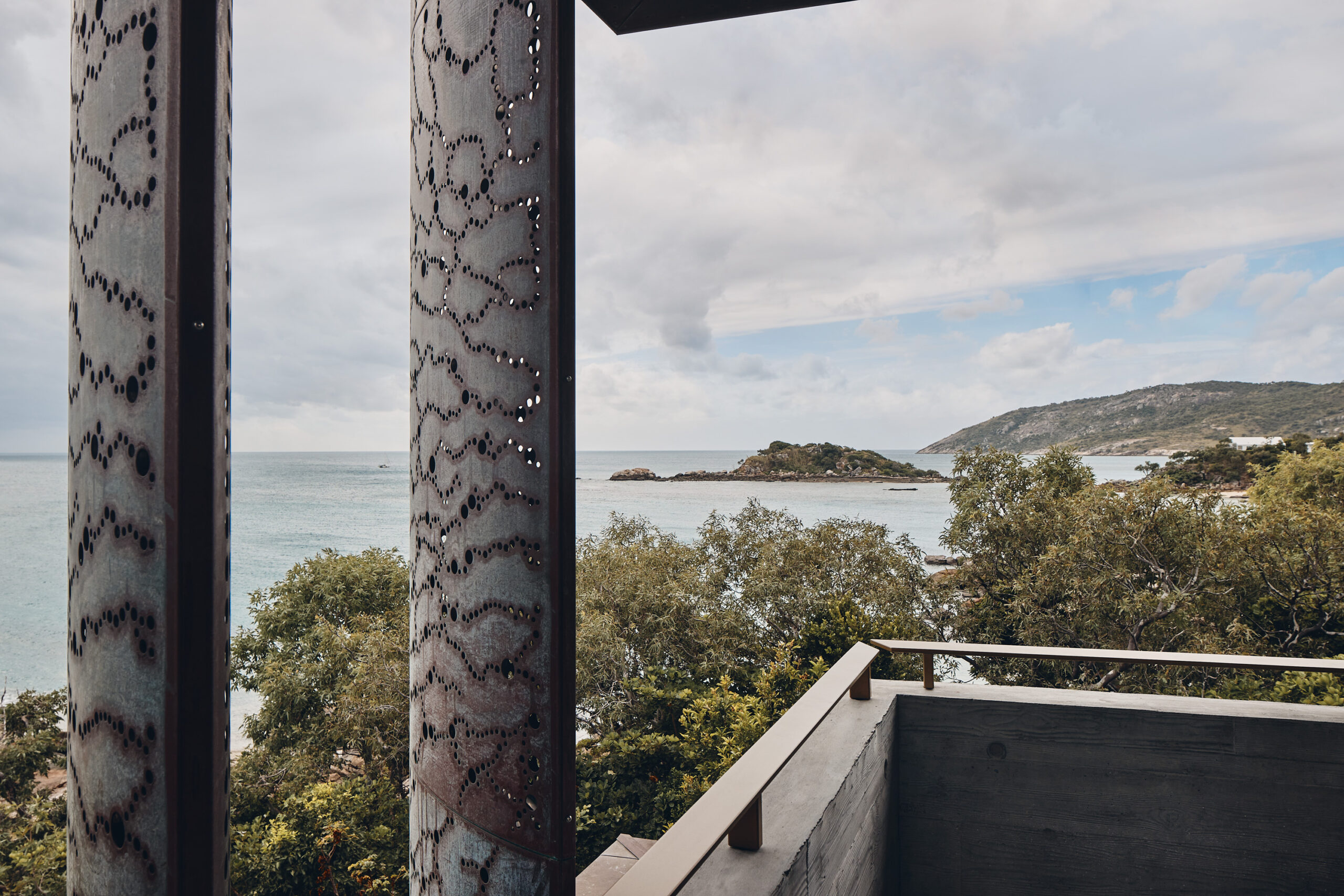 The building’s robust, board-formed concrete exterior is highly functional as it is aesthetical. The striking and rugged landscape lends itself to cyclonic winds and harsh weather conditions. As a result, The House is designed and built to shelter and protect when needed. Perforated copper blades lining the exterior are visually beautiful and act as debris shields that can withstand cyclonic winds intrinsic to this reef.