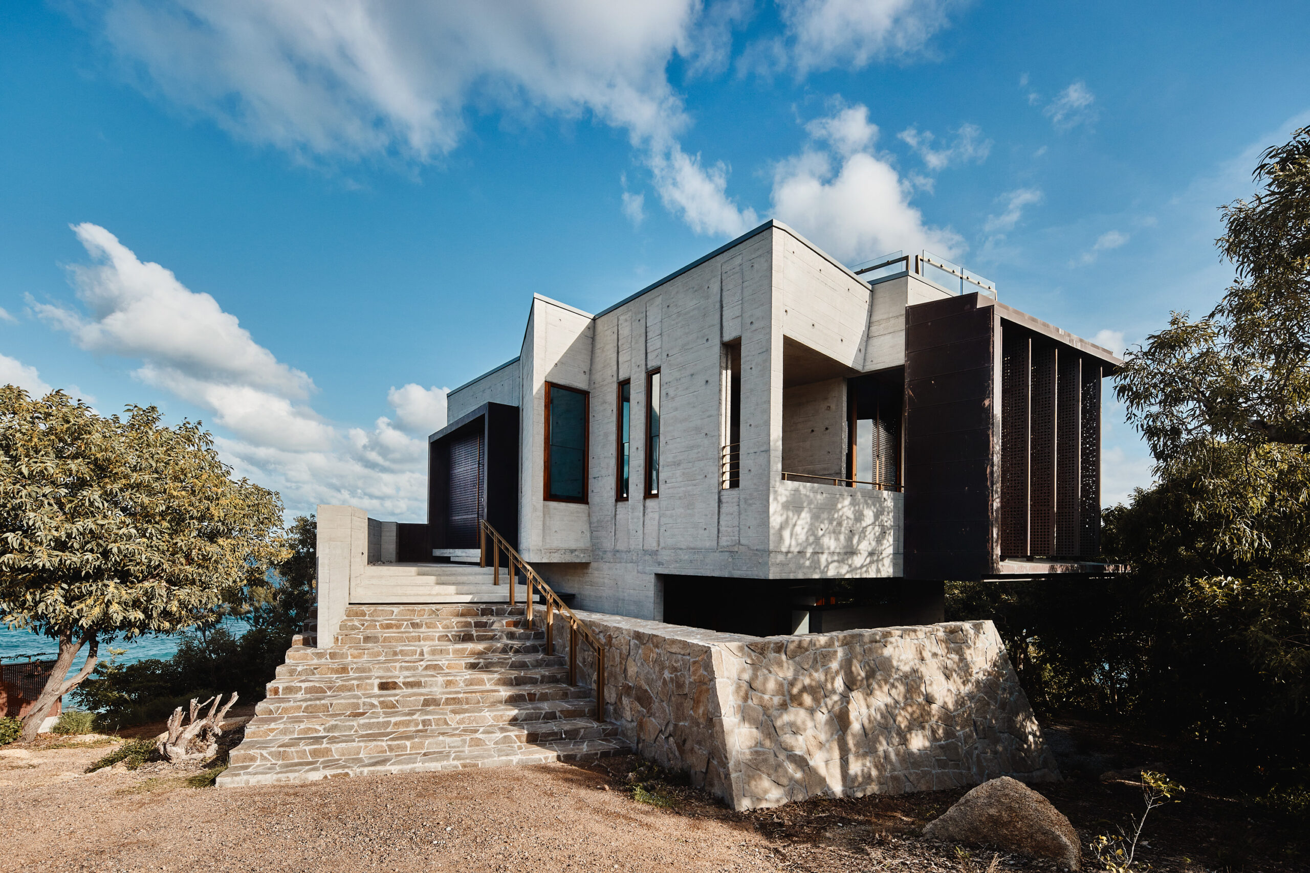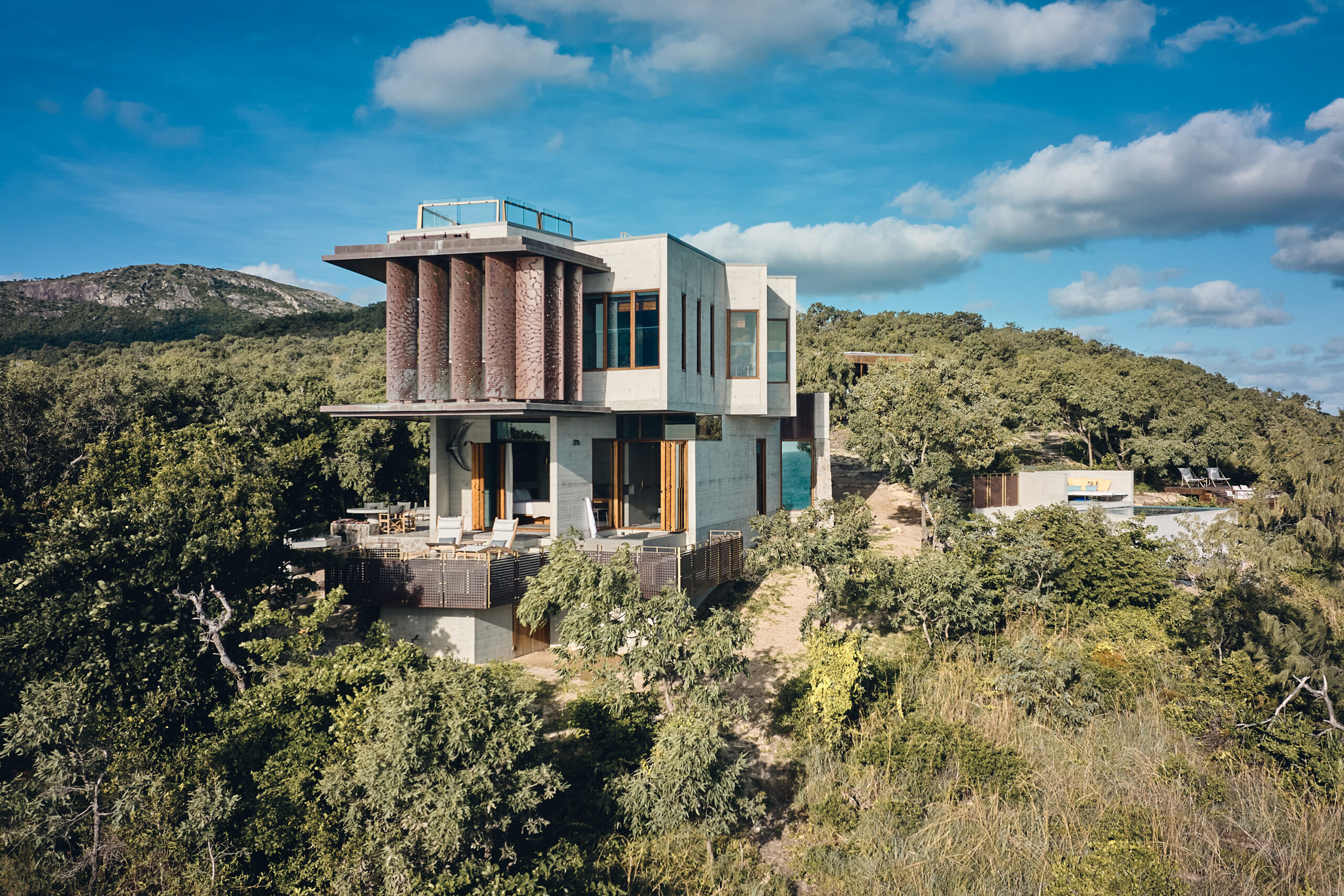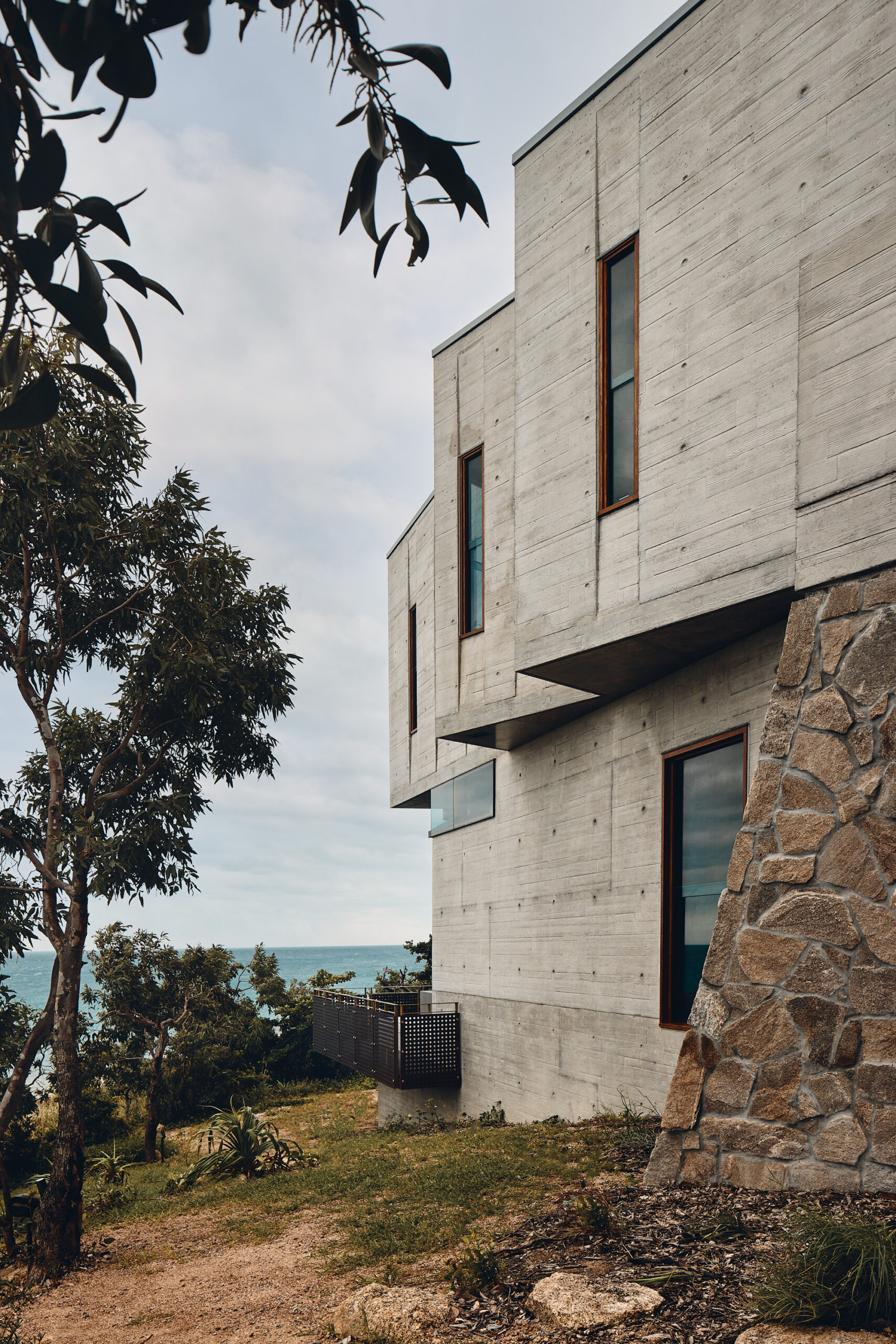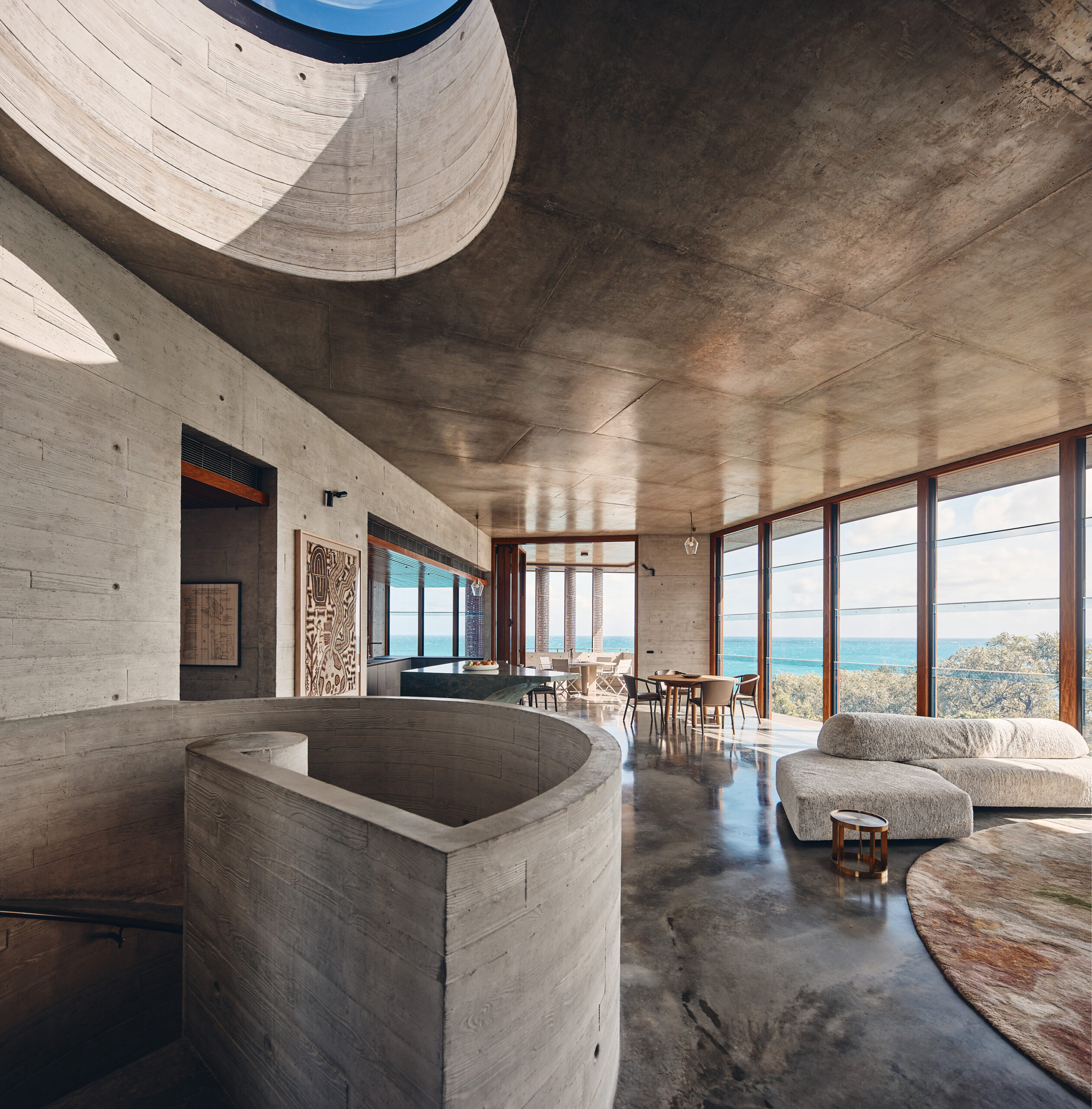 The building’s robust, board-formed concrete exterior is highly functional as it is aesthetical. The striking and rugged landscape lends itself to cyclonic winds and harsh weather conditions. As a result, The House is designed and built to shelter and protect when needed. Perforated copper blades lining the exterior are visually beautiful and act as debris shields that can withstand cyclonic winds intrinsic to this reef.