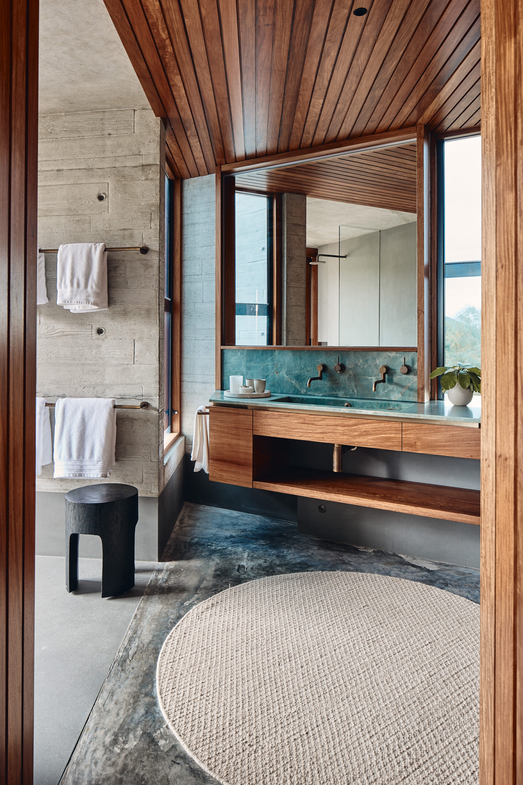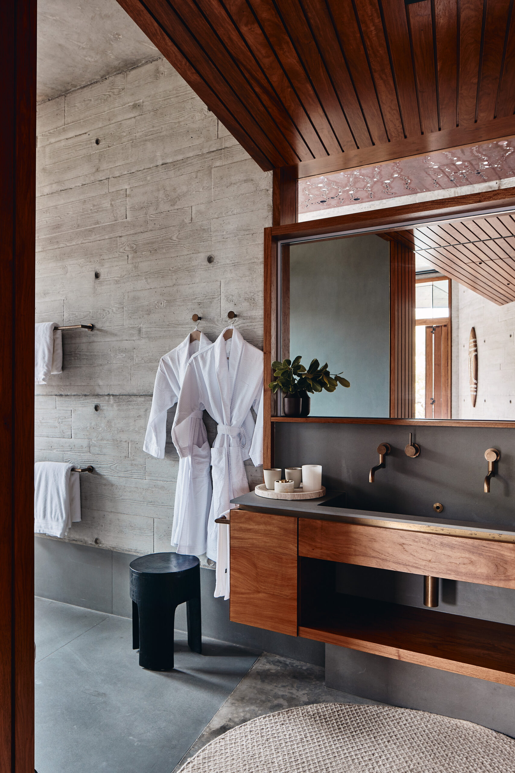 Rosewood timber and copper materials bring warmth to The House and serve as a canvas for the vibrant colours of the spectacular natural environment. A large curving Emerald Quartzite kitchen bench echoes a conch, with subtle green tones that complement the hues of the landscape and reef beyond The House. The material selection is intentionally restrained.